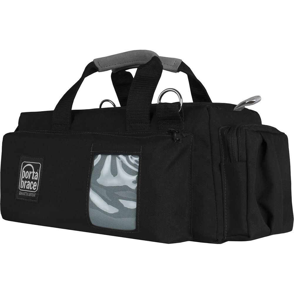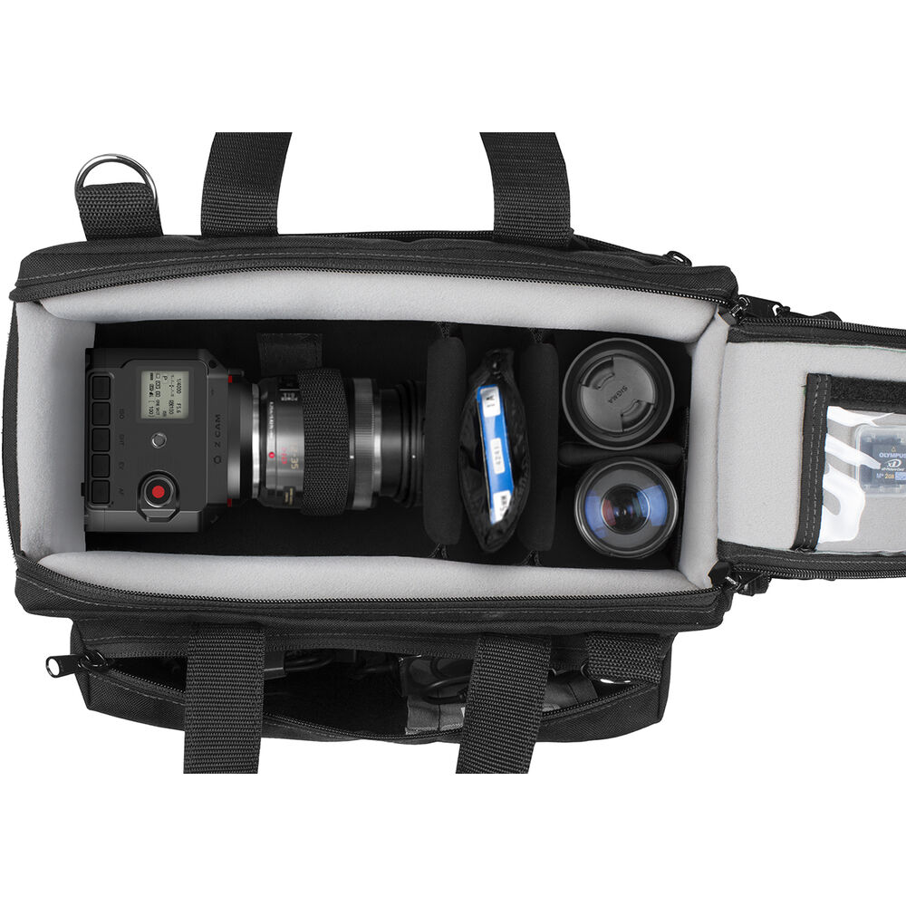 This bag has two padded exterior side pockets, as well as zippered exterior front and back pockets for carrying accessories. Front and back slip pockets allow for storing thin items such as manuals or white balance cards (not included). The case has an abrasion-resistant 1000-D Cordura nylon exterior with a skid-resistant waterproof bottom, so you can set it down outside without fear of getting the contents wet. The case features reverse-sewn zippers for added wear resistance. You can comfortably carry this made-in-the-USA bag with the removable shoulder strap or the suede-grip top handles.