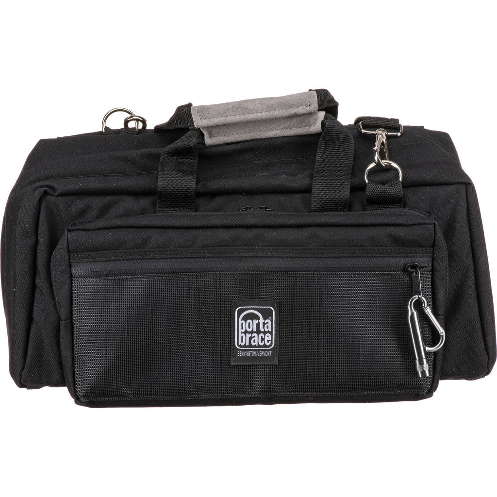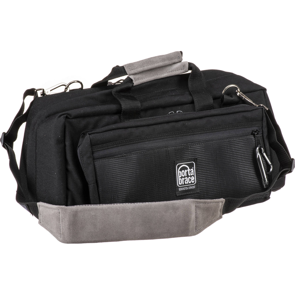 The black with copper string CS-DC3R Digital Camera Carrying Case from Porta Brace is designed to carry and protect a pro digital SLR camera with an attached zoom lens, 2-3 additional lenses and accessories. It has Slip-Not anti-skid material which adds an extra layer of protection against water, dirt and grime with an easy wipe-off surface on the bottom. There is a bottom panel that is reinforced with 8mm hollow core plastic. The case has 1 exterior mesh pocket, 1 exterior zipper pocket, an interior zipper pocket that has 5 slip pockets. There are removable, zippered padded 9.0 x 9.0" and 6.0 x 6.0" pouches and a removable universal, adjustable hold down cradle. It is carried by 2 suede leather covered handles or removable, adjustable suede leather covered shoulder strap.