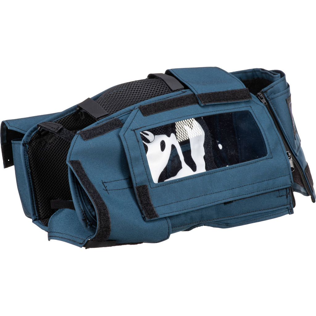 The blue Shoulder Case from PortaBrace is a custom-fit, padded, protective cover made using a water-resistant, highly abrasive-resistant, soft-feel fabric designed to hold the Panasonic AJ-CX4000 camera with its accessories. The cover protects your camcorder from bumps, impacts, and scratches. It also reduces the risk of camcorder damage due to precipitation, dust, and other harsh conditions. The back end is expandable to accommodate various sized batteries and wireless microphone combinations.