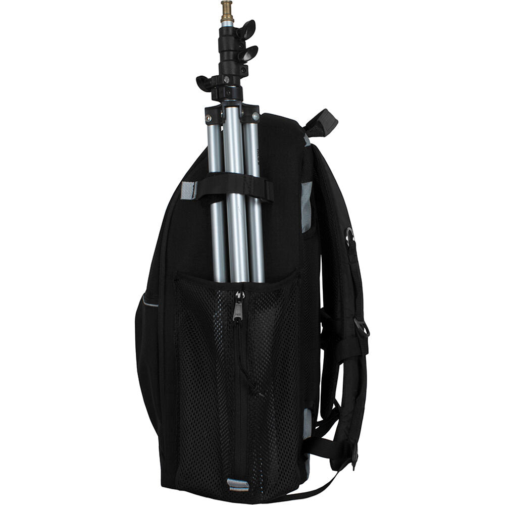 One side of the backpack features a zippered pocket above an elastic pouch. The other side sports a pocket and adjustable strap for holding and further securing a small tripod. The front exterior has a clear-windowed pocket to hold your ID or business card, plus a large zippered pocket.