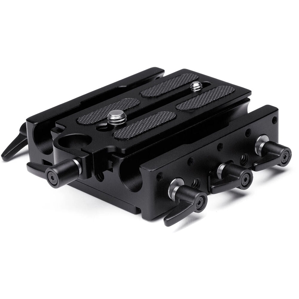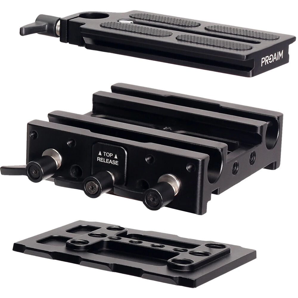 The 15mm Universal Bridge Plate from Proaim offers 15mm LWS rod support for camera accessories and versatile tripod mounting. This aluminum baseplate system consists of an ARRI-style bridge plate, an Arca-Swiss camera plate, and a short ARRI-standard dovetail plate. This system enables you to detach your camera from your tripod with or without including the attached rod support system.