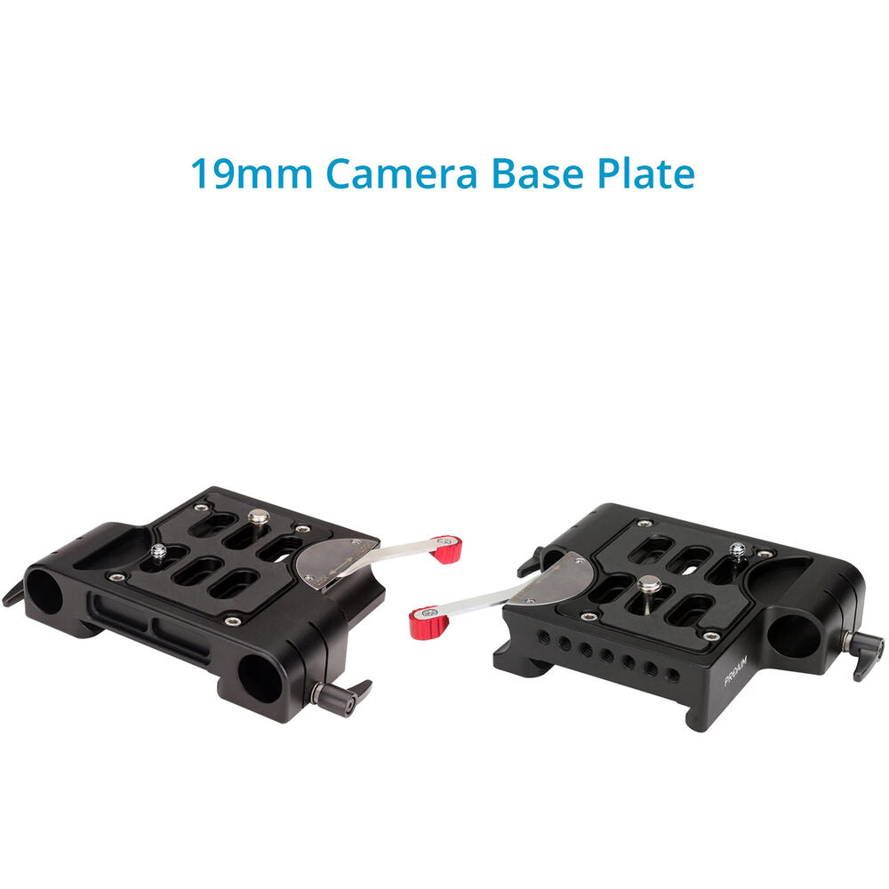 The 19mm Studio Bridge Plate with ARRI-Style Dovetail from Proaim offers 19mm rod support for camera accessories. This aluminum baseplate system consists of a bridge plate and a 10" ARRI-standard dovetail plate. The bridge plate features a center plate that can be flipped from ARRI standard height to RED standard camera height.