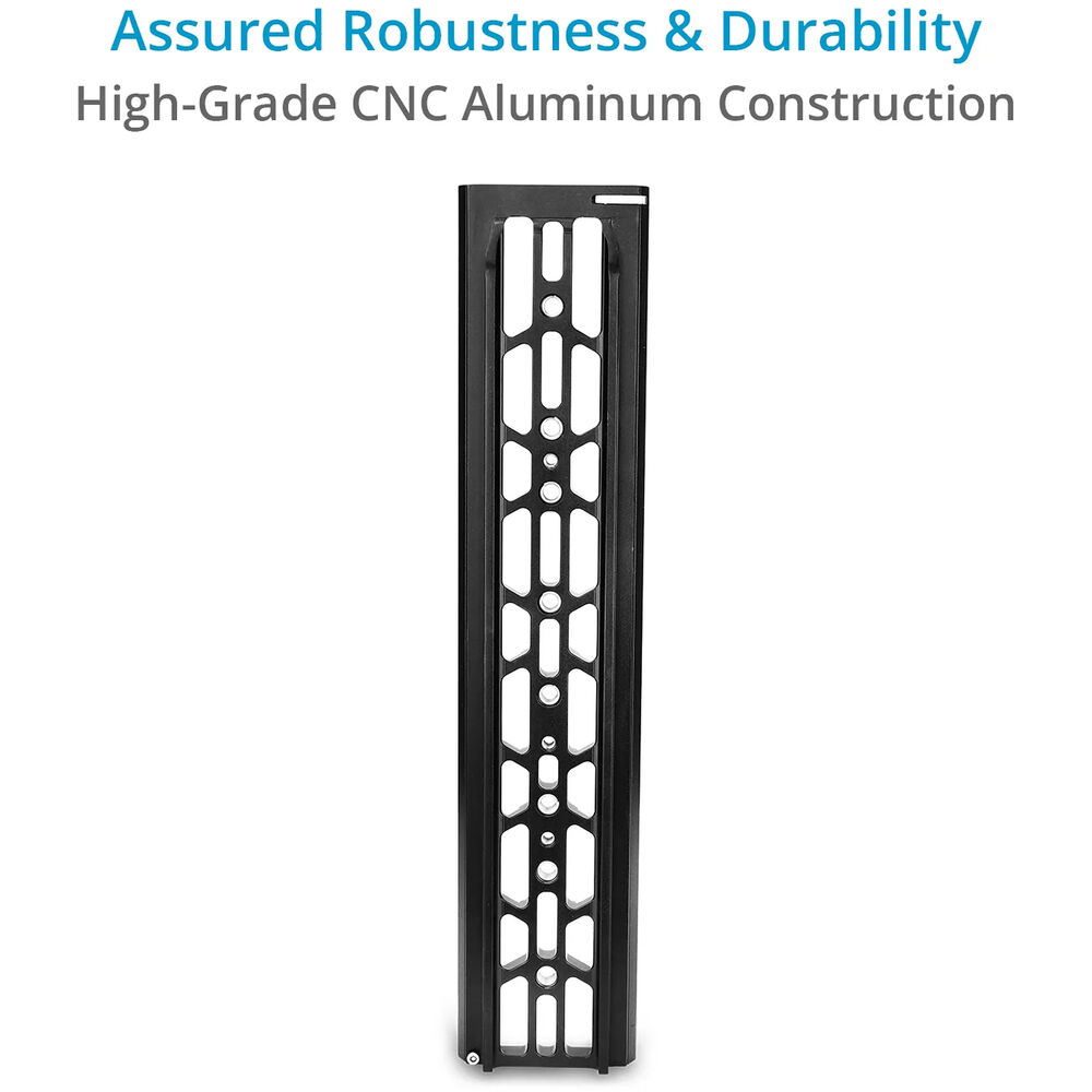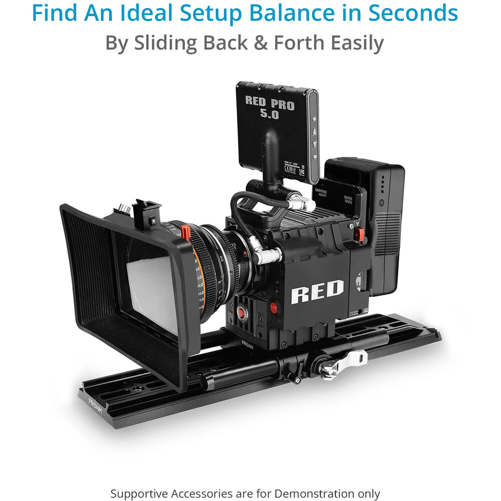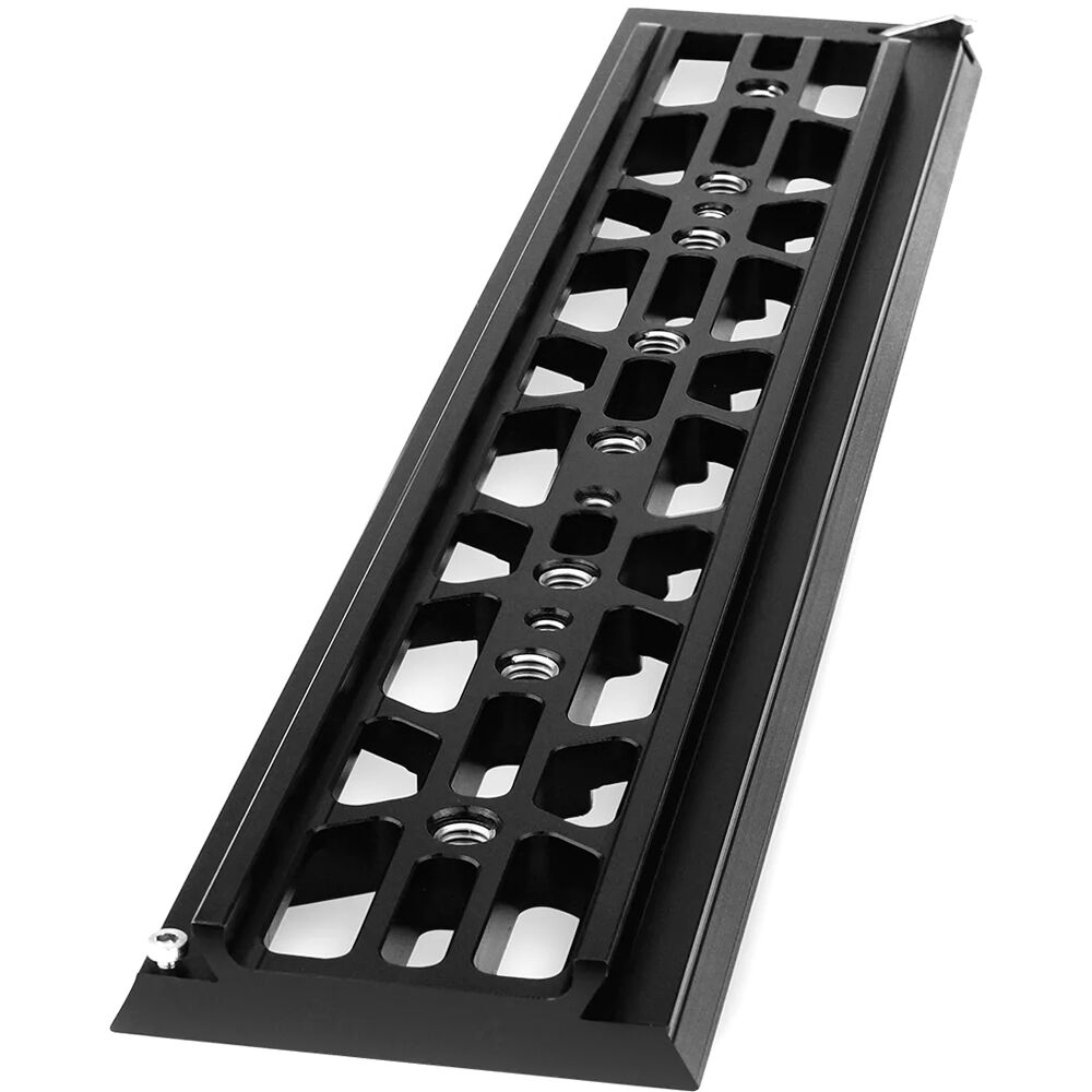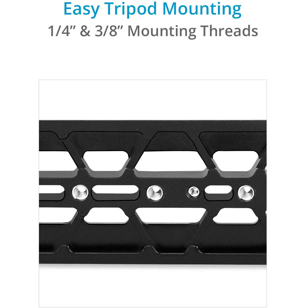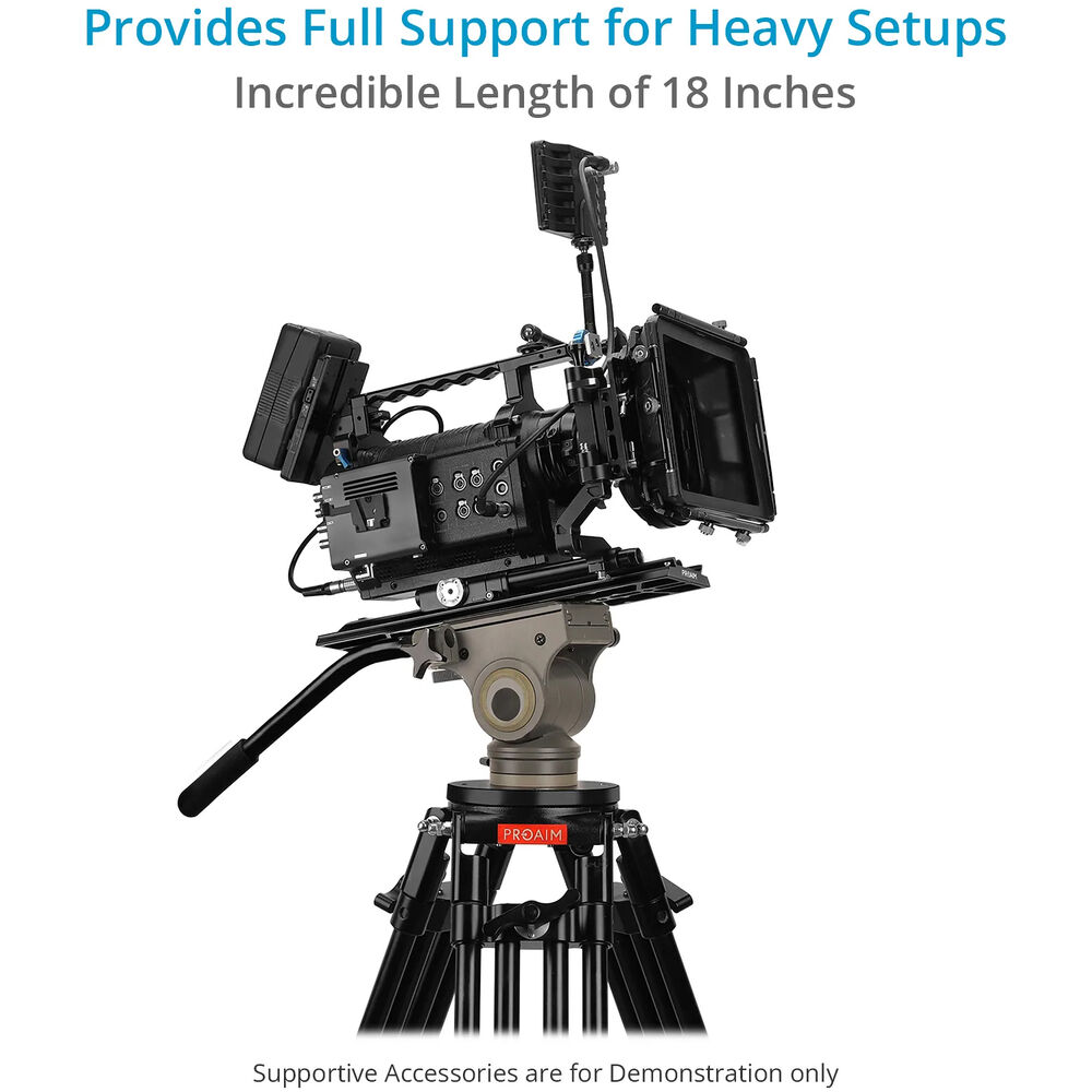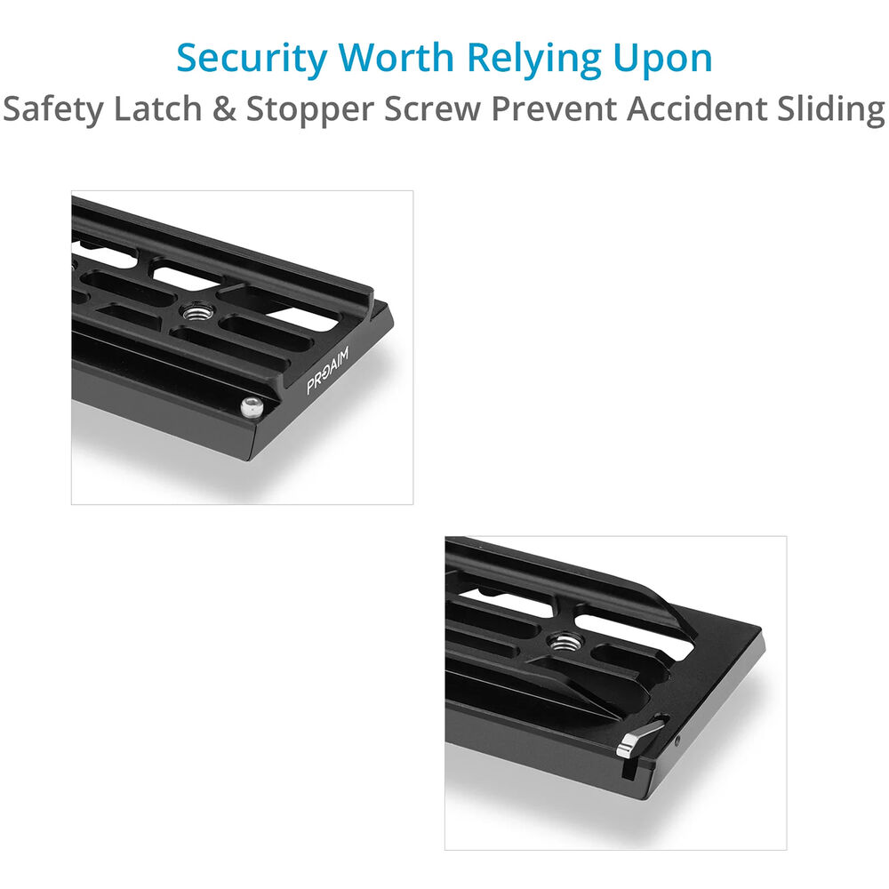 The 18" ARRI-Style Dovetail Plate from Proaim provides a solid balancing solution for front- or back-heavy camera setups. The high-grade CNC aluminum plate also works best on heavy-duty tripod heads like the OConnor 2060, 2575, and 120EX, or the Sachtler Cine 30. The plate's center features multiple 1/4"-20 and 3/8"-16 threads for flexible mounting options, and a stopper screw and safety latch keep gear from slipping off from either end of the dovetail plate.