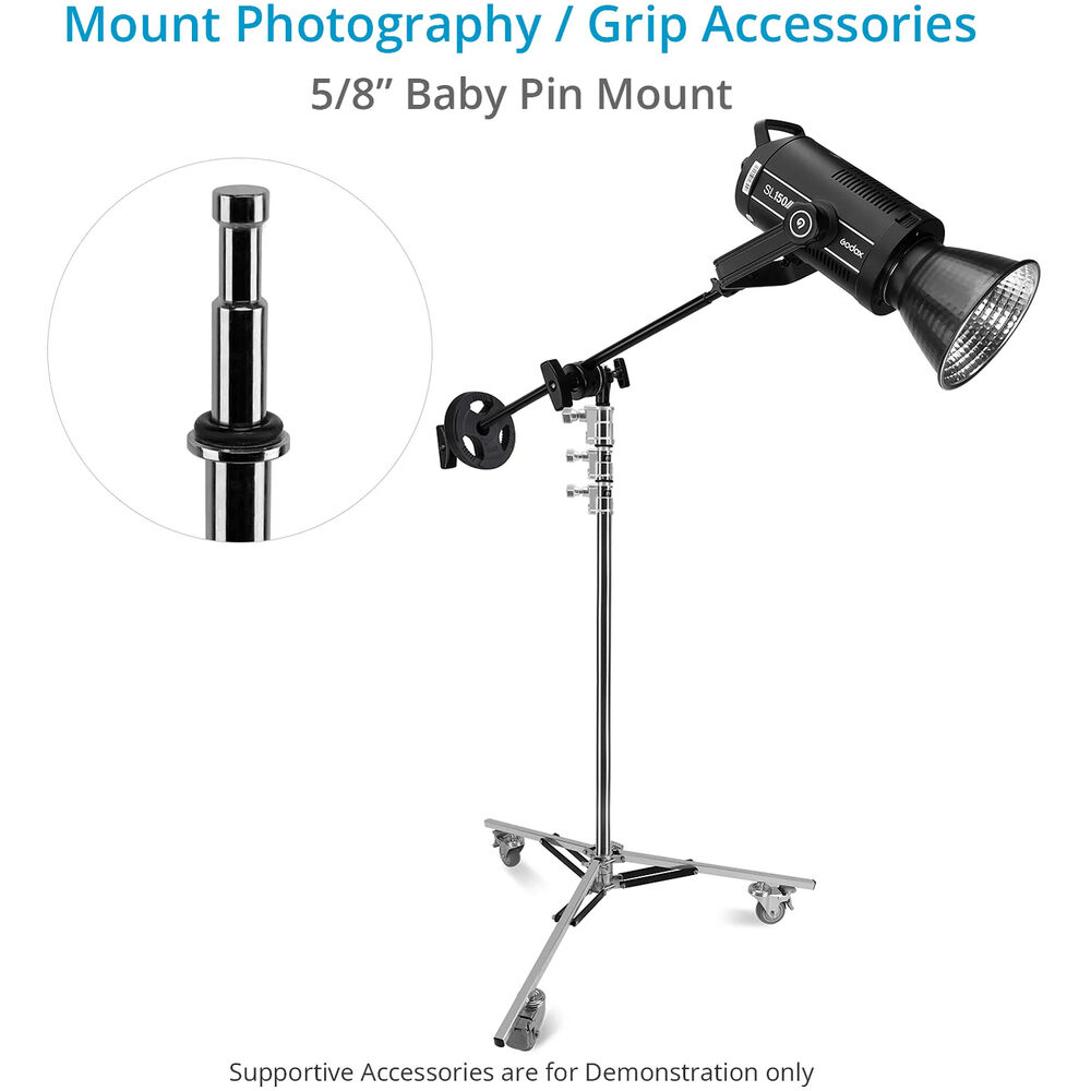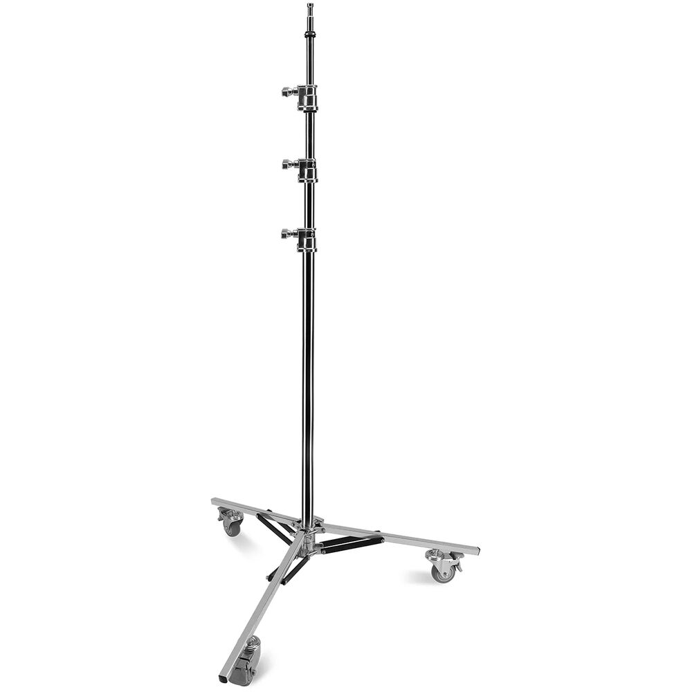 This Baby Junior Triple Riser Wheeled Stand from Proaim is designed for easy repositioning even at maximum height. This four-section stand can support heavy gear weighing up to 30.8 lb. It rises to a significant height of 12.2' with a minimum working height of 4'. This steel support features a stable base, braking wheels, long collapsible legs, and a mid-level spreader. It is topped by a 5/8" baby stud for wide compatibility with photography gear. Portable for storage and transportation, this sturdy stand is quickly collapsible.