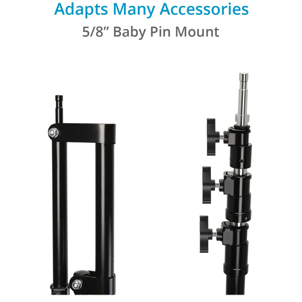 - The top of the arm has 5/8" baby pin to facilitate overhead lighting, microphone positioning, reflectors, softboxes, etc.