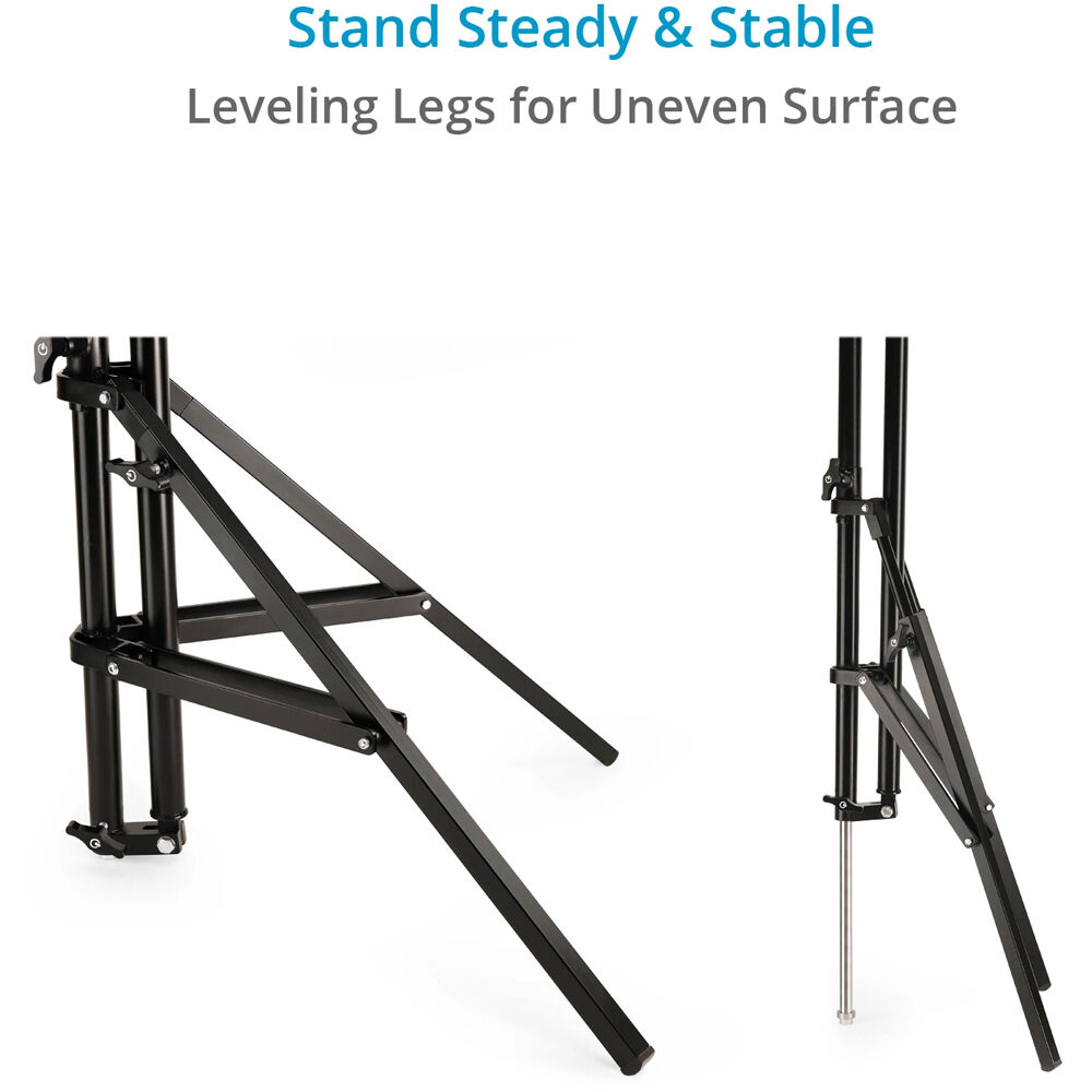 - The stand has two legs on the front and a central column, all of which are equipped with quick leveling knobs for uneven stairs, hills, and curbs without using apple boxes.
