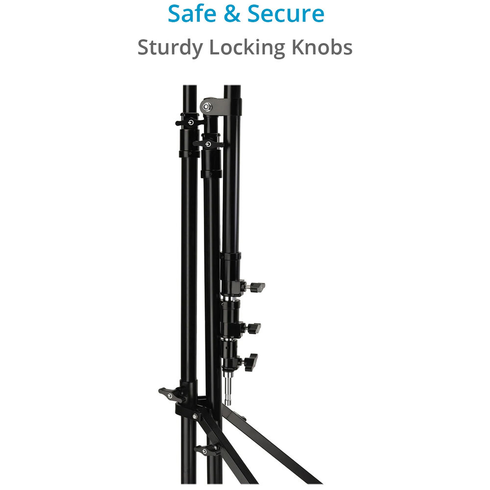 Designed to be an all-purpose support, the steel and aluminum Proaim Boom Light Telescopic Stand with 5/8" Mount for Photo & Lighting Gear combines a versatile stand with a three-section boom arm. The stand height is variable from 5.5' to 8'. It has two legs at the front and a central column for variable angles on stairs and uneven terrain, which can be locked in place with quick-leveling knobs.