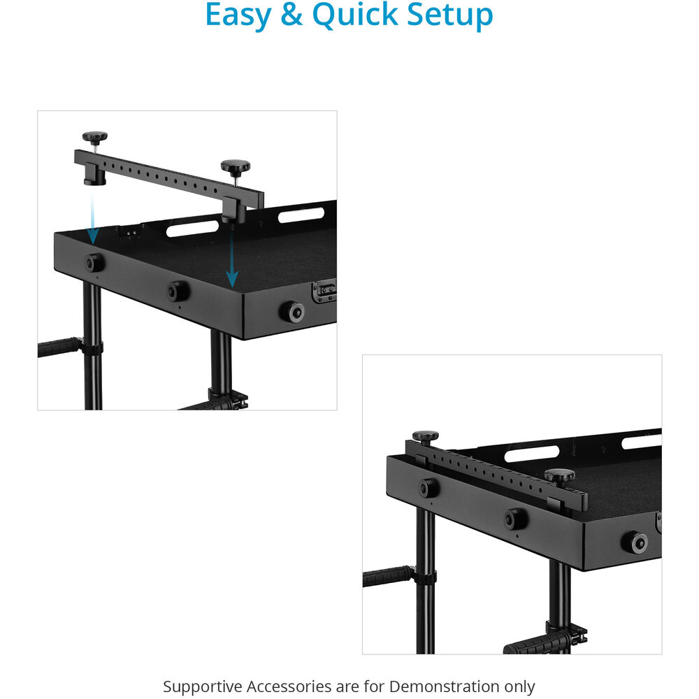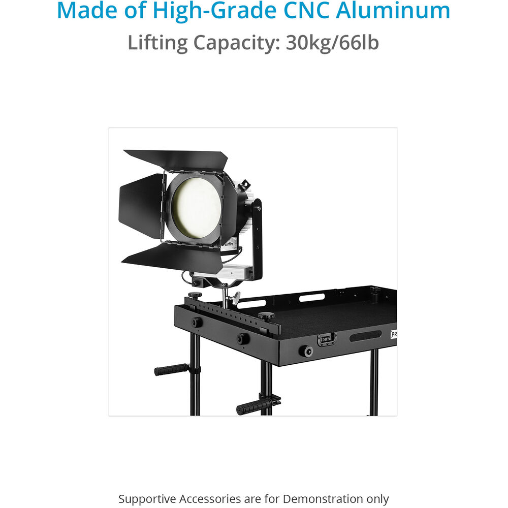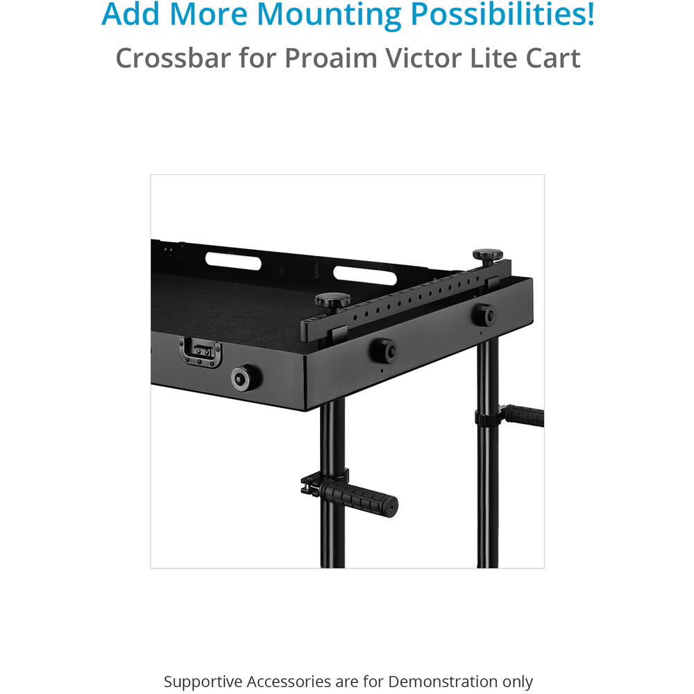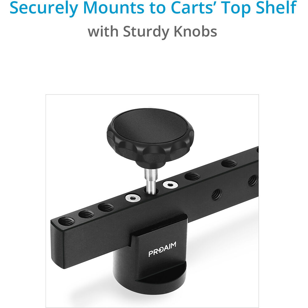 Enhance the versatility of your Victor Lite Camera Cart with this Proaim Cheese Cross Bar, which offers you the most convenient and creative way to customize the cart. This long crossbar mounts on the top shelf at the narrow side of the cart and gives it incredible accessory mounting flexibility. It is made of high-grade CNC aluminum and offers a lifting capacity of up to 66 lb. It has multiple 3/8"-16 threaded holes for mounting various photo/video accessories to provide ongoing support for your production.