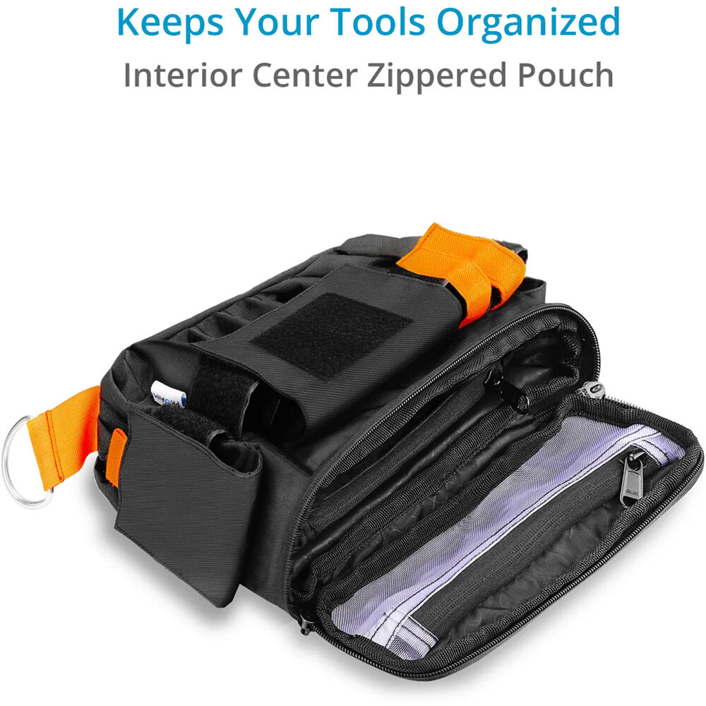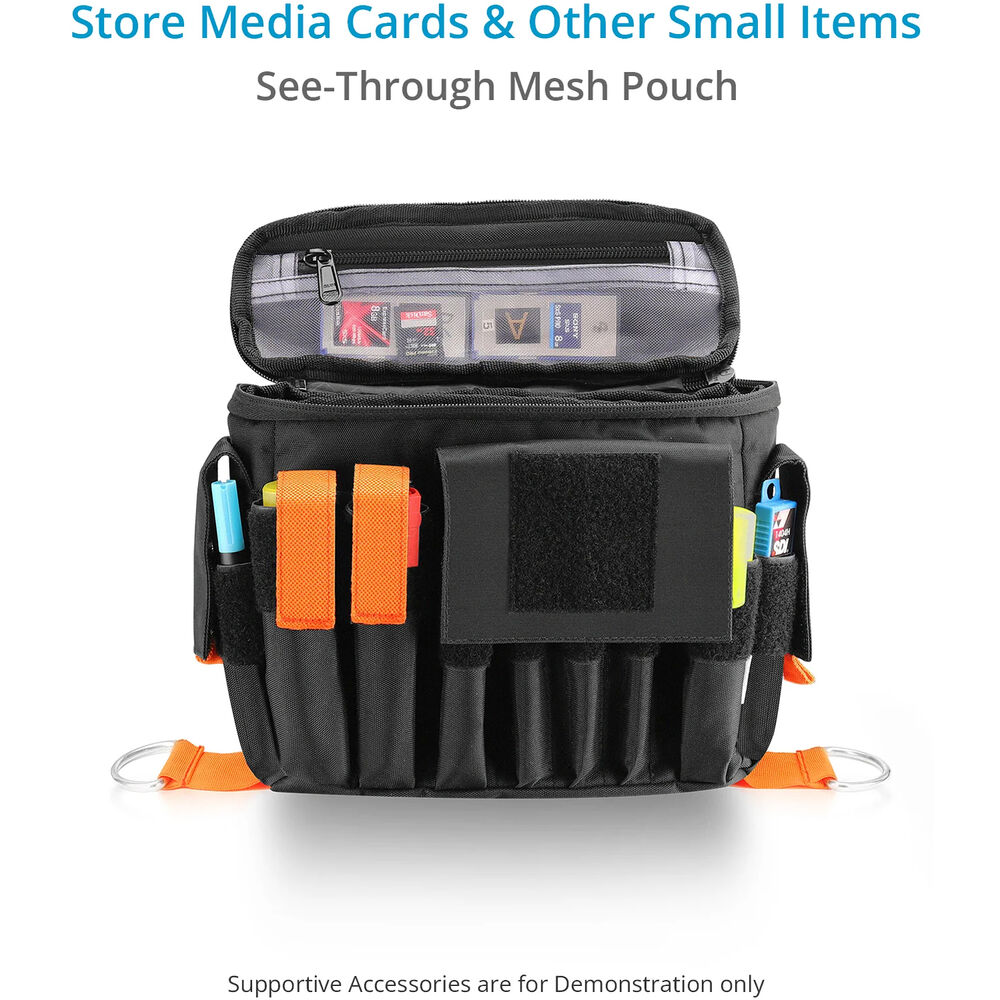 Ideal for grips and camera assistants, this extra-large Proaim Cube AC Pouch is designed to organize quick-access tools like markers, tape, and radios. The pouch features multiple exterior pockets and a hook-and-loop flap to protect the three interior pockets. A mesh pocket inside the flap stores a notebook or lens filters. Exterior belt loops allow you to secure the pouch to a waist belt. Two D-rings on either side of the pouch attach carabiners or keys. The pouch is water resistant to prevent damage to your tools.
