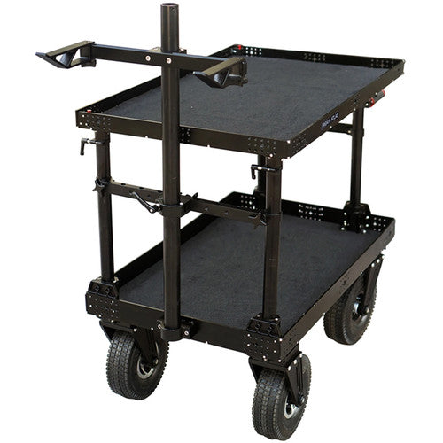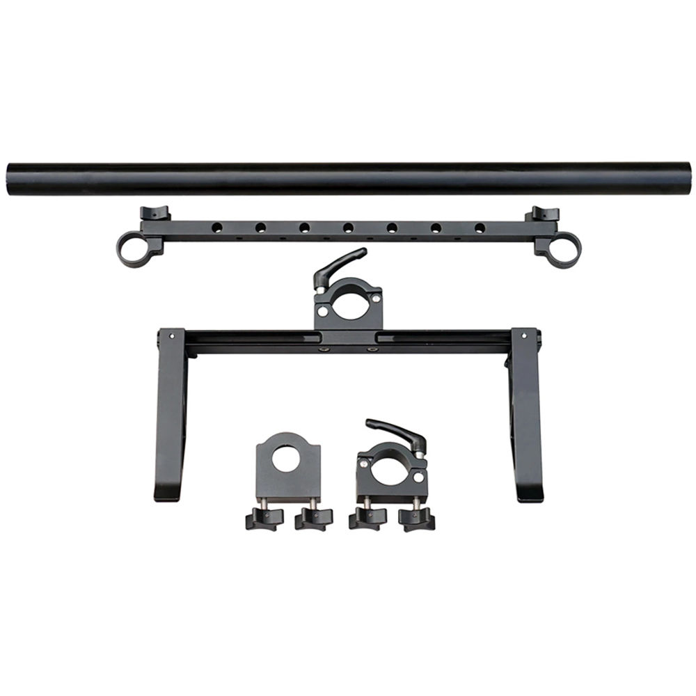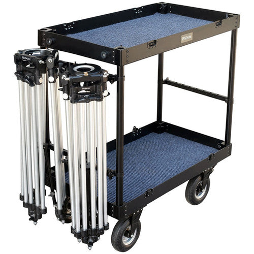 The Dual Tripod Holder attaches to 1.5"/38mm masts of supporting equipment carts, such as the Proaim Atlas V2, Victor, and Victor 1.1. It allows you to place two full-size tripods on it when they aren't being used. It supports up to 110 lb in total. The two components that hold the tripods can also be squeezed closer together to hold one tripod by means of a VCT or similar plate.