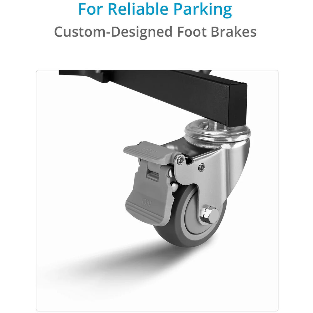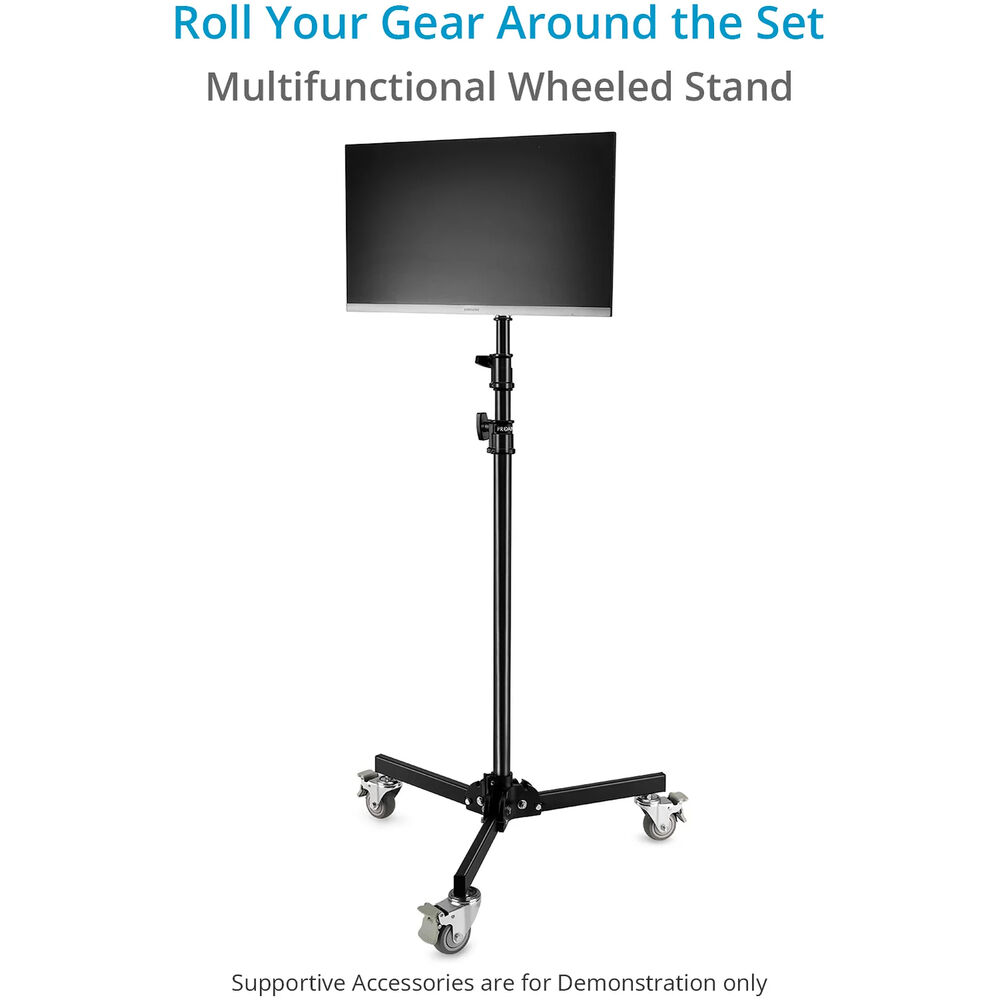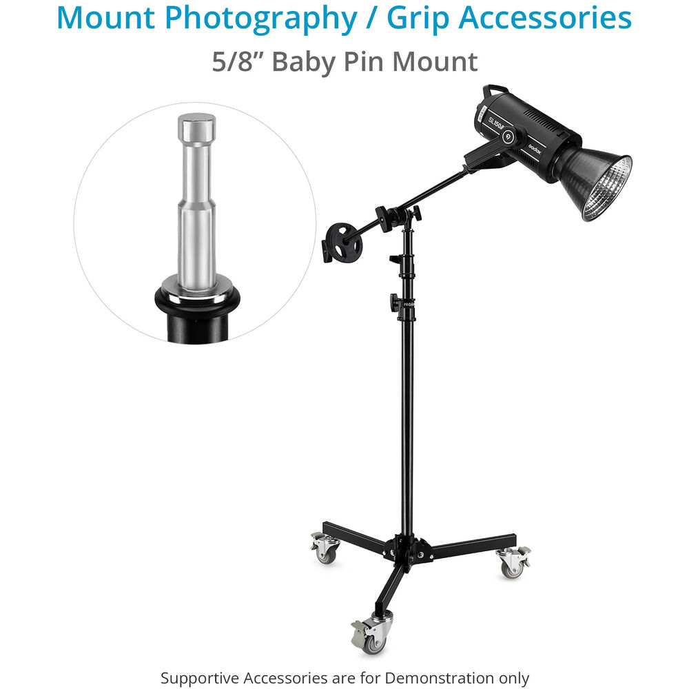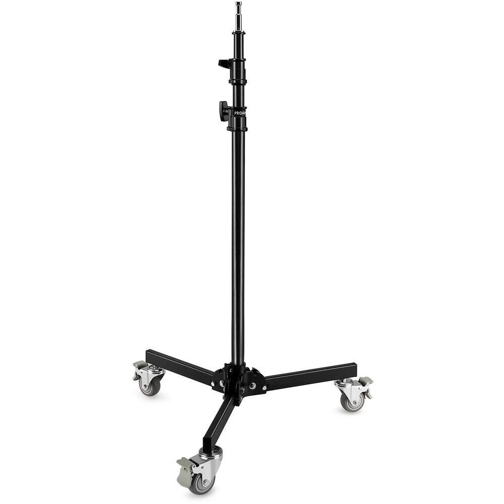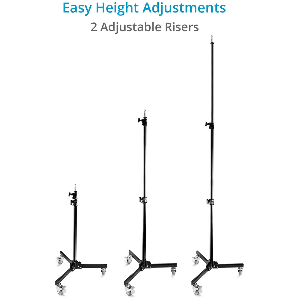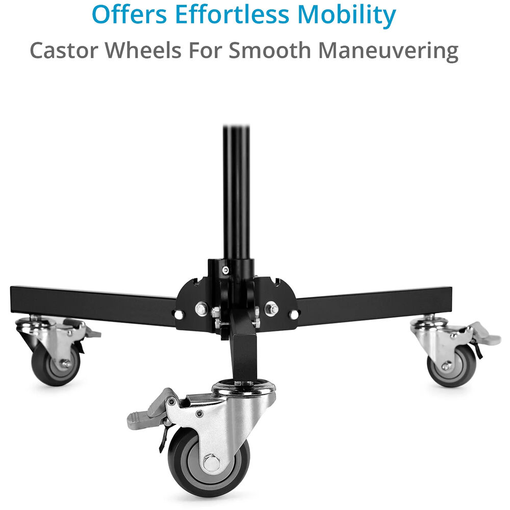 Ease up the movement of your gear using this Folding Wheeled Base Stand from Proaim. This three-section stand supports lights with a load capacity of 30 lb at minimum extension and 11 lb at maximum extension. It rises to a maximum height of 8.6' and has a minimum working height of 3.4'. Once positioned, locking 3" wheels make sure the stand stays put. The legs provide a stable base and fold up conveniently for storage and transport. This steel stand is topped with a 5/8" stud for wide compatibility with photography equipment such as lights, reflectors, softboxes, and others.