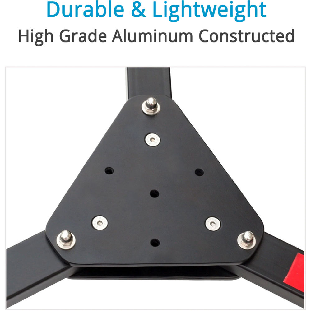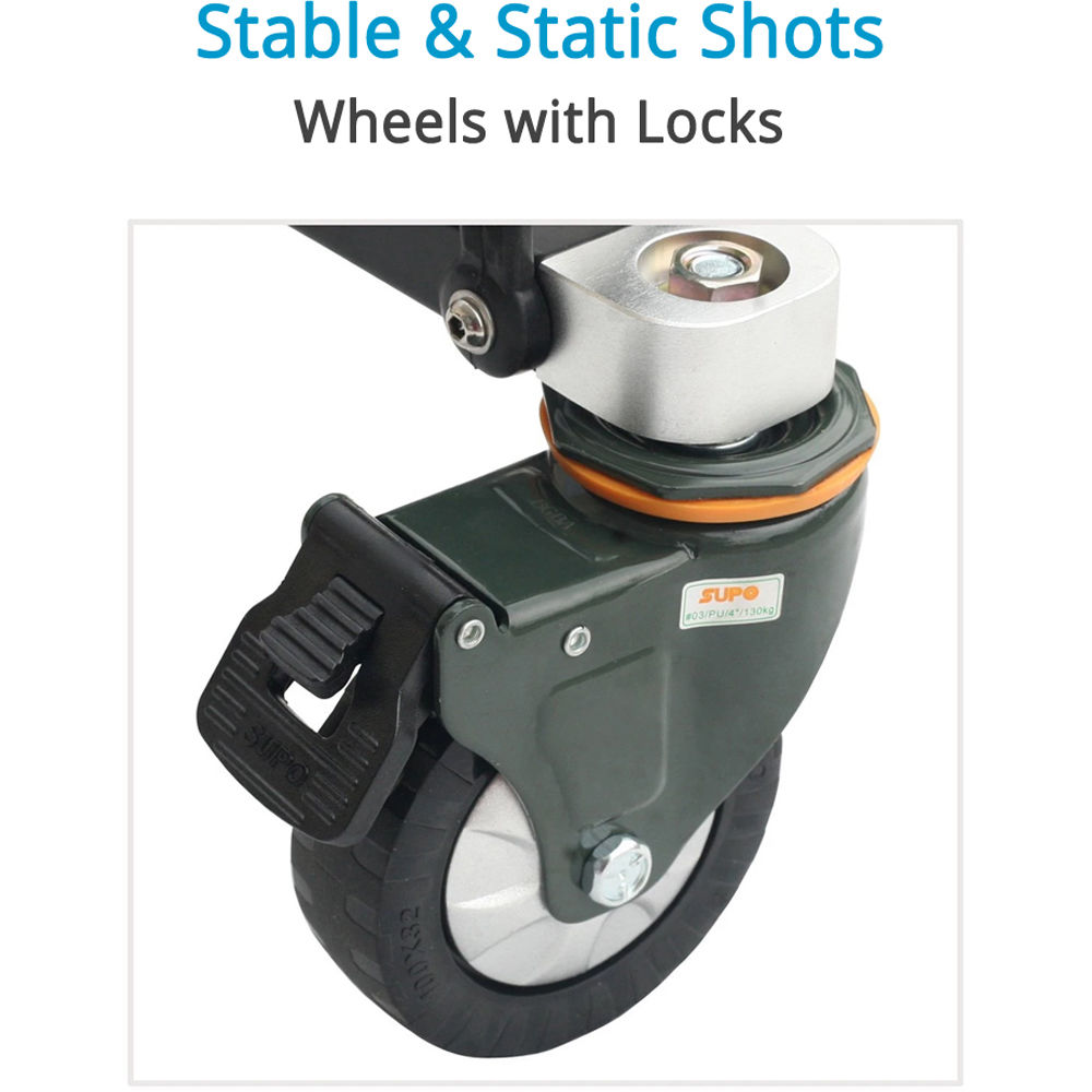 Steer your tripod along any line imaginable to capture a smooth tracking shot with the Heavy-Duty Portable Tripod Dolly from Proaim . The durable, three-leg aluminum dolly features polyurethane wheels that feature revolving casters and convenient wheel foot locks to keep the dolly in place.