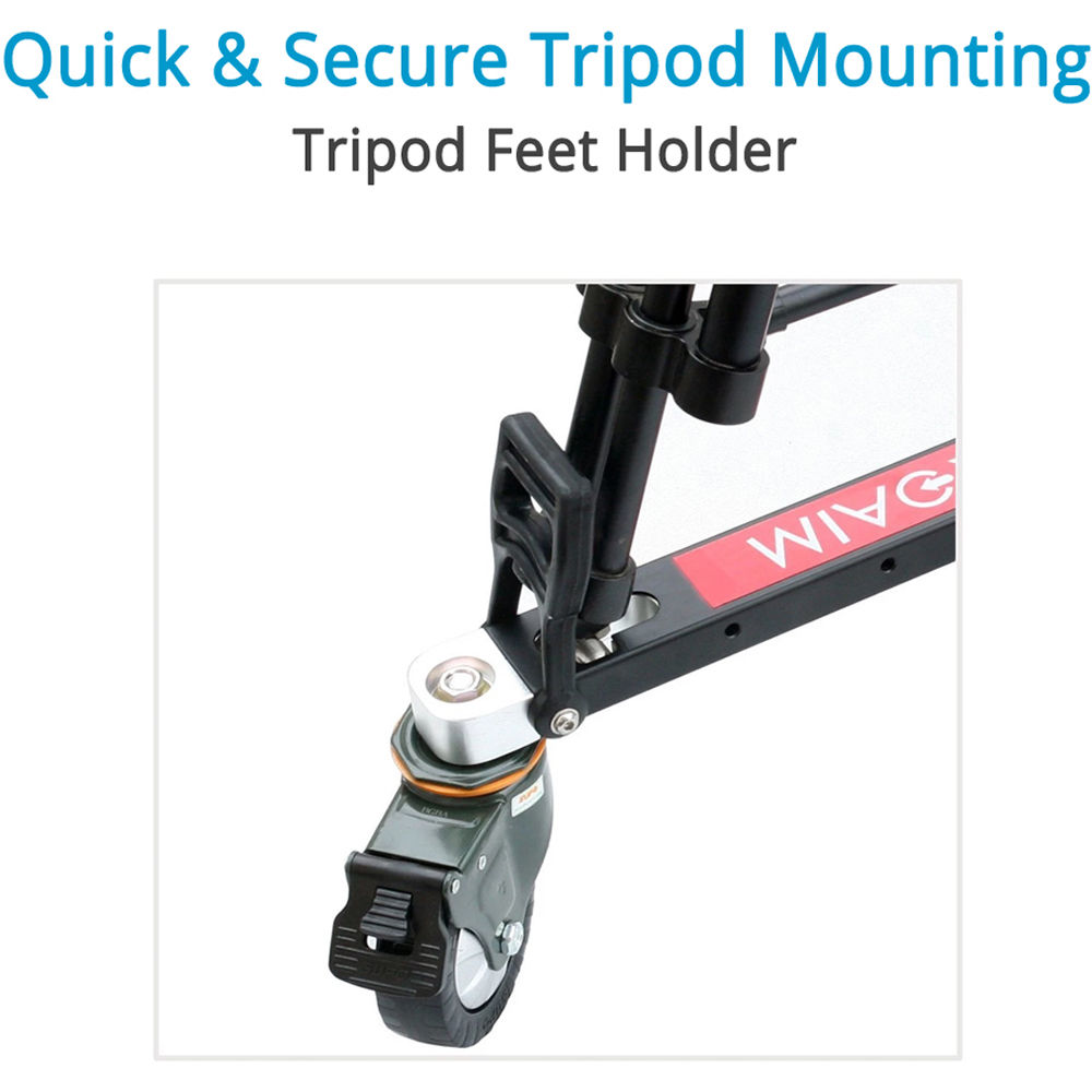 The heavy-duty dolly can support rigs up to 1100 lb and weighs 23.5 lb. It can accommodate any tripod with dual-spiked feet and secures the feet with mounting clasps. The dolly collapses easily and features a carry handle for portability.