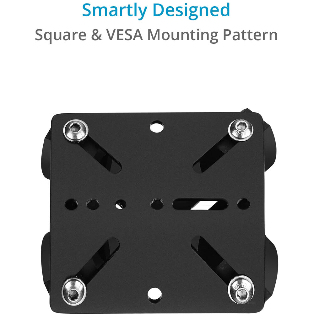 Reduce vibrations in your PTZ camera footage with the PTZ-10 PTZ Camera Vibration Isolator Mount from Proaim. This mount features a steel casing with thick rubber washers and a load capacity of 22 lb. Camera mounting options include a VESA pattern, multiple 1/4"-20 threads, and several slots.
