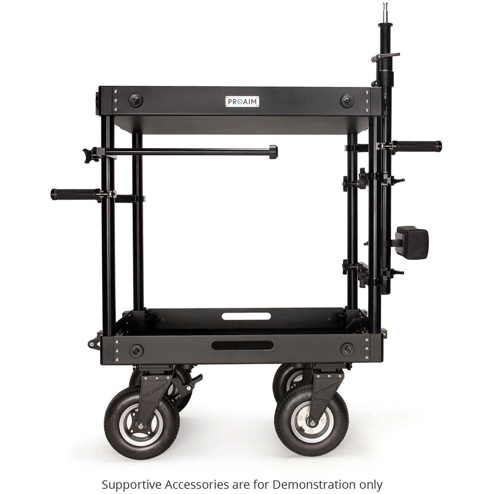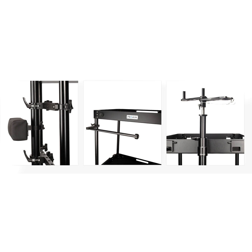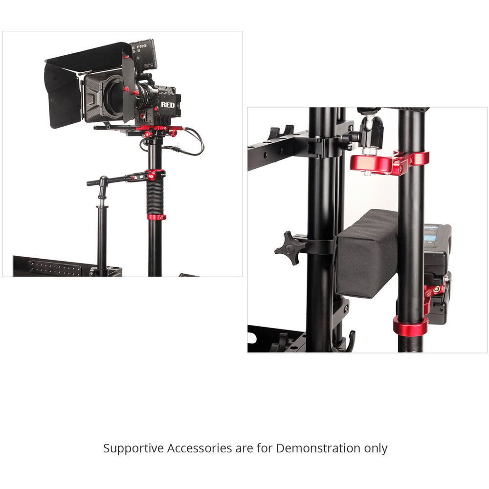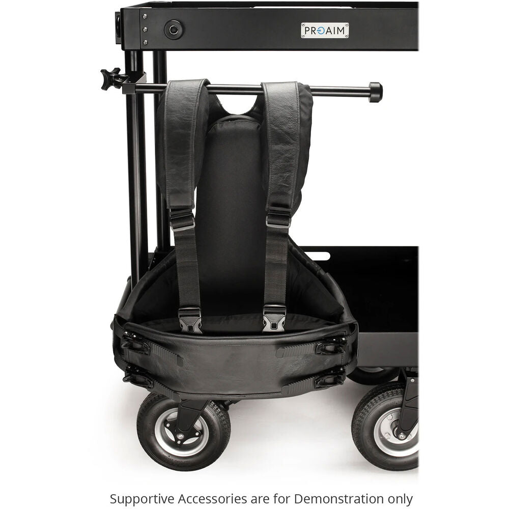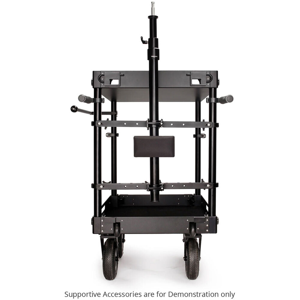 The Proaim Stabilizer System for Camera Production Carts is designed for Proaim Victor and Atlas Carts, and it allows you to mount a sled-style stabilizer that uses a 5/8" baby pin adapter onto the cart. Supported stabilizers include full-size Stabilizers and Flycam Flowline models. The Stabilizer System features an aluminum-made 1.75" mast and a 2-stage riser with a 5/8" baby pin adapter. It also has an adjustable vest rod holder and a bumper pad to provide the necessary support for a traditional sled-style stabilizer.