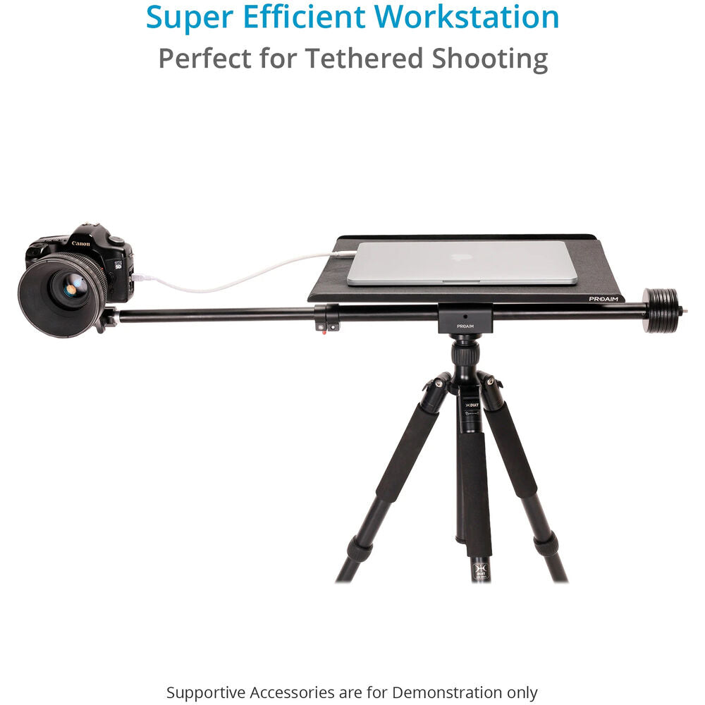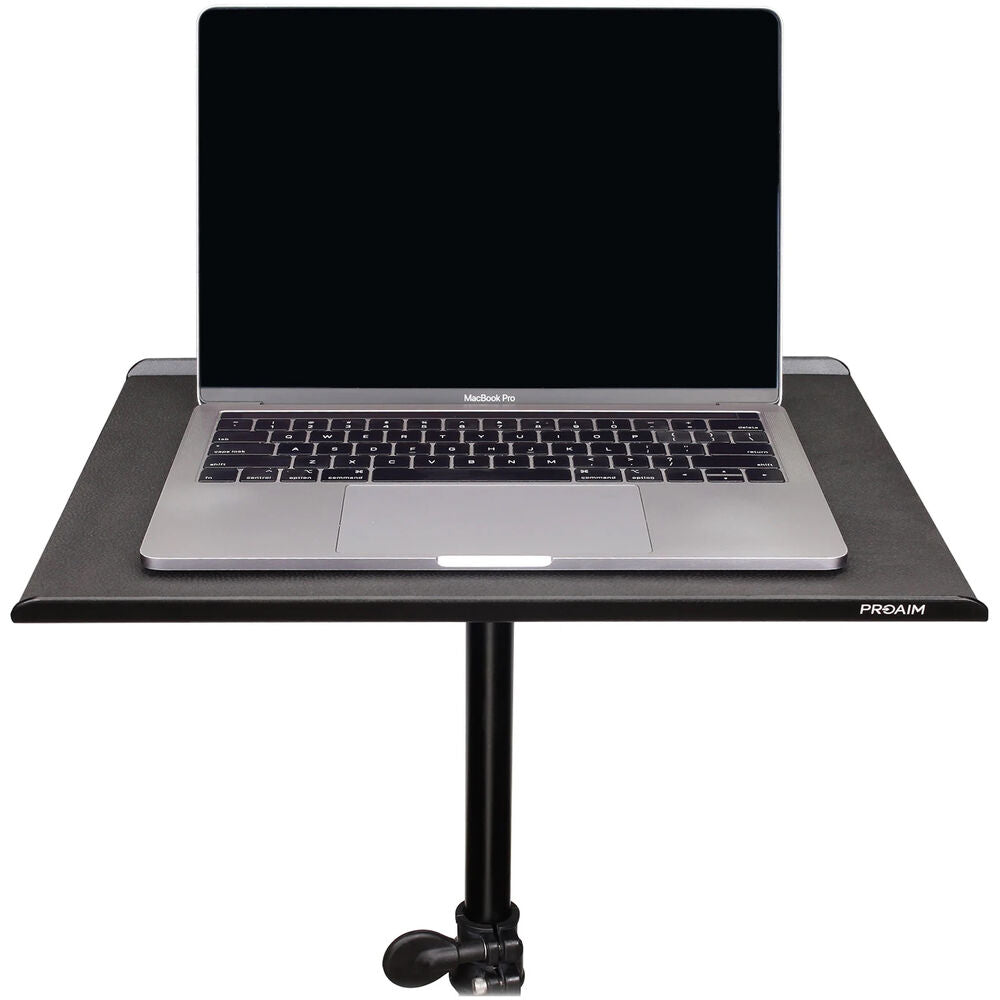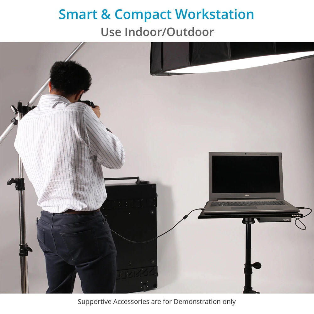 Create your own tabletop while you're on location with the Proaim Universal Laptop Workstation. Designed primarily for photographers, videographers, and other creative professionals, this portable flat surface attaches securely to most C-stands and supports laptops up to 16 x 13" in size. Use it to enhance your workflow with tethered shoots and to quickly make edits and adjustments as you capture photos and videos. The Proaim Universal Laptop Workstation is constructed from high-grade aluminum for strong, lightweight support and connects to C-stands with 1/4"-20, 3/8"-16, and 5/8" threads. It also has a non-slip foam mat to keep your laptop in place as you work while the raised front and back edges help to prevent it from sliding off. A slim bag is included for easy storage and travel.