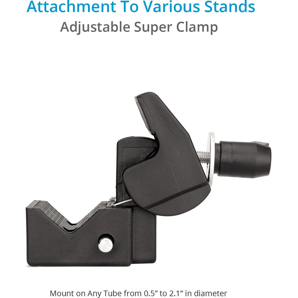The tray features a 5/8" receiver and a 1/4"-20 & 3/8"-16 female thread, which can mount onto light stands, C-stands, and tripods. The tray's height is easy to adjust. The included Universal Super Clamp is an indispensable piece of equipment designed to mount arms and gear to a wide array of round surfaces. It is made of high-quality materials and can be securely mounted on any tube from 0.5 to 2.1" in diameter. This Utility Tray saves space and time, and is also more convenient for carrying around.