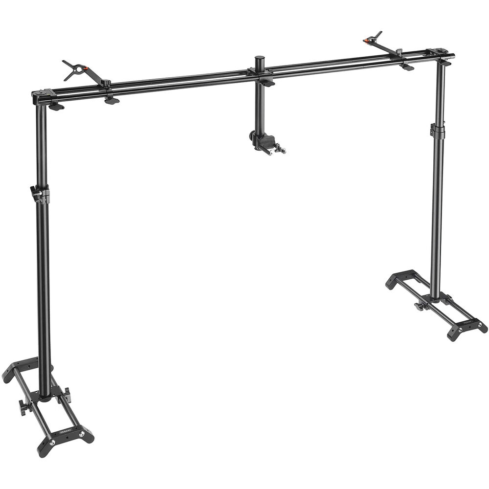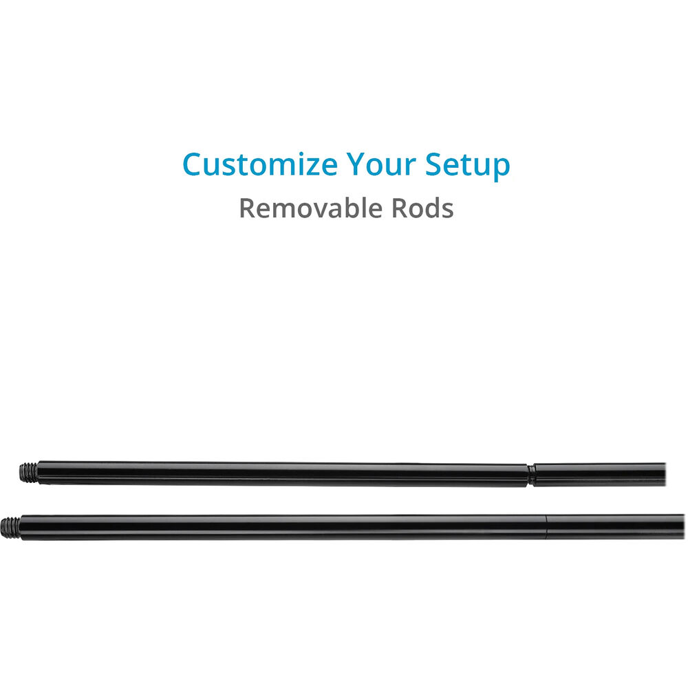 The rig features a 4.4 lb load capacity to support most lightweight recording devices. A center bar mount has an integrated 1/4"-20 screw to secure your camera or the included smartphone adapter. Built-in bubble levels and included pole stands ensure your setup is level no matter where you place it. Multiple 1/4"-20 and 3/8"-16 threads throughout and a 1/4"-20 to 3/8"-16 bushing adapter can accommodate lighting accessories or articulating arms for further gear expansion. You can even attach the backdrop brackets onto the rig to hang sheets with the plastic clips for product photography or other photoshoot applications.