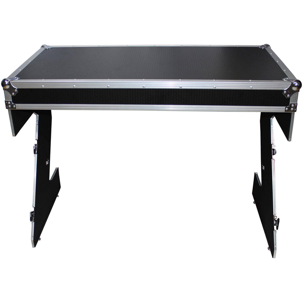 The silver-on-black ProX DJ Z-Table MK2 is a Z-style DJ table flight case with handles and wheels, rendering it highly portable, simple to set up, and easy to break down for DJs around the world. Its durable construction features 3/8" plywood with a Honeycomb Digital laminated surface design that helps prevent minor to mild scratches while providing extra visual flair.