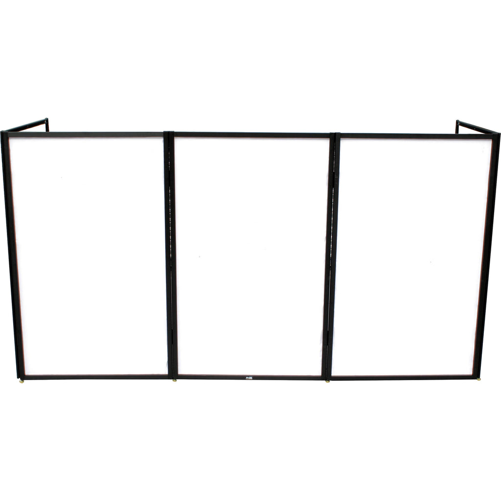 The Pro DJ Facade features five detachable aluminum panels, which are equipped with stainless-steel, 180° quick-release hinges for fast and easy setup and teardown. It includes a set of white scrims and a set of black scrims. The scrims are translucent and can be used with lighting systems to create color wash effects.