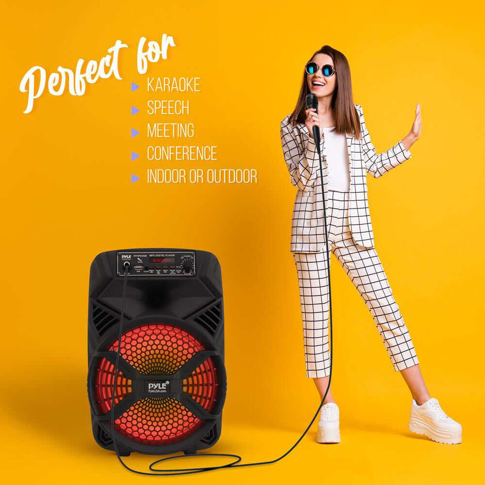 The PPHP836B Portable 8" 300W PA Speaker System with Bluetooth from Pyle Pro is a portable, versatile PA system designed to entertain small groups and parties for hours of fun. Featuring an internal rechargeable battery (with up to two hours of life), a wireless remote control, and the ability to stream MP3s from devices via USB, aux input, and Bluetooth, this PA system is built to provide enough versatility for everything from entertainment during parties, to serious public addresses and group presentations.