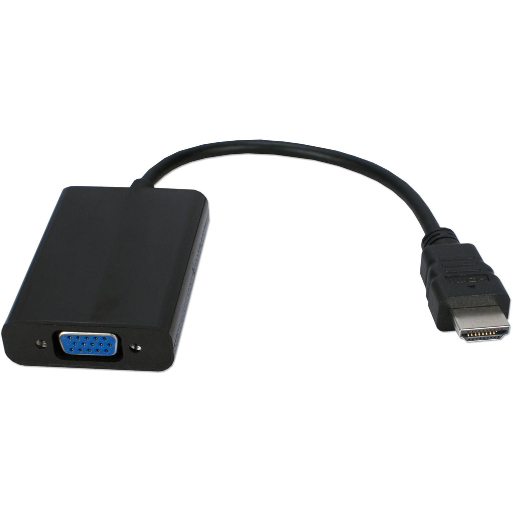 The HDMI to VGA Video Converter from QVS makes it easy to take the HDMI output from your laptop, tablet, or desktop computer and convert it to a VGA female port, allowing it to be used with compatible monitors and projectors at resolutions up to 1080p60 and 1440p60. The converter also has a 3.5mm audio output to de-embed the audio from the HDMI input for output to speakers. It is compatible with existing VGA cables and its built-in HDMI cable measures 6" in length. The converter is powered by the VGA port, and it can be used with an optional DVI-to-VGA adapter for additional video support.