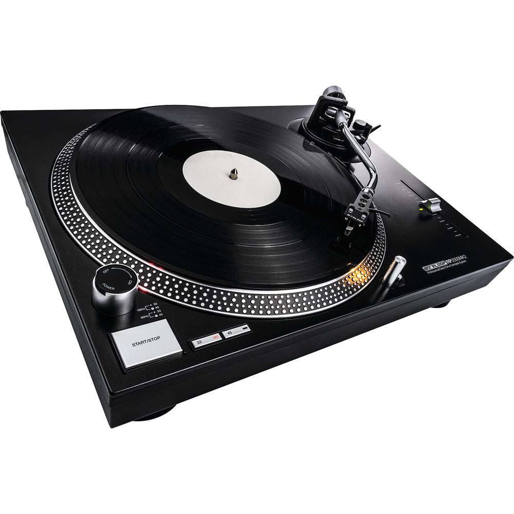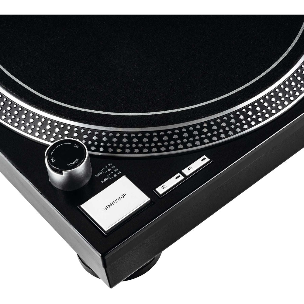 The metallic black Reloop RP-2000 MK2 is a quartz-driven, direct-drive turntable designed for DJs practicing at home, or performing at parties and gigs. With sturdy, reinforced construction and a die-cast aluminum platter, it is built to withstand the rigors of routine transport. Speeds of 33-1/3 and 45 rpm are manually selectable via dedicated top-panel buttons, and a precision fader allows easy pitch control.