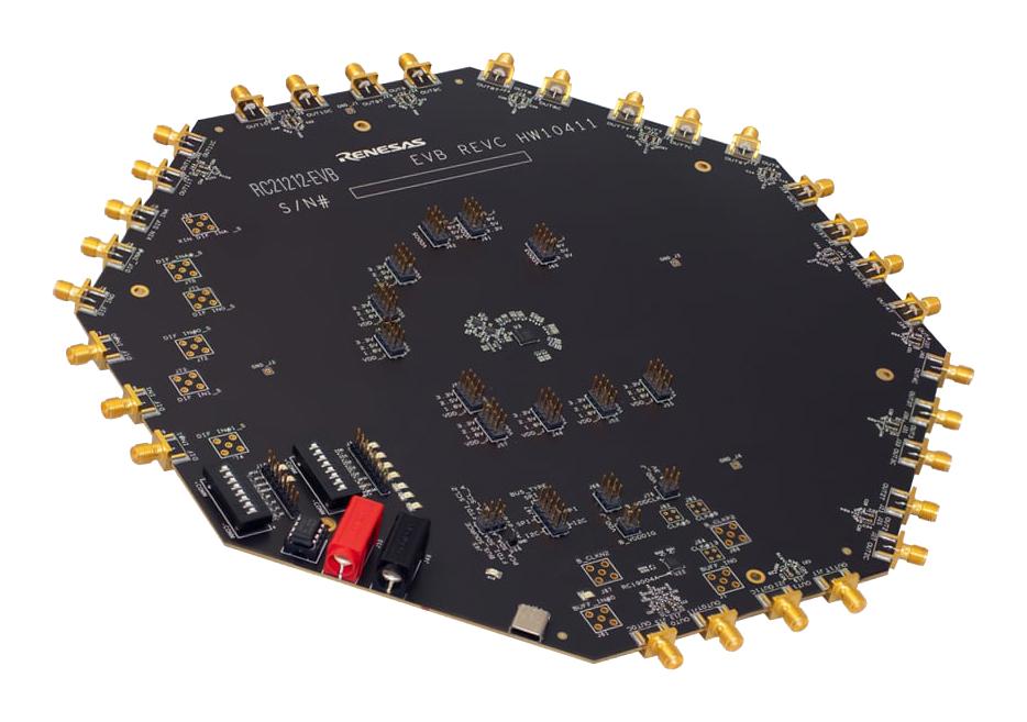 RC21212-EVB is a 12-output AutoClock programmable clock generator evaluation board. This evaluation board (EVB) is designed for evaluating the RC21212 using clock generation in synthesizer mode for commercial automotive applications and PCIe Gen 1-6 compliance. When the EVB is connected via USB to the computer running the Renesas Integrated Circuit Toolbox (RICBox�) software, the RC21212 can be configured in various frequencies with best-in-class commercial performance. The EVB can function in the temperature range of -40°C to 105°C and is capable of operating in VDD values of 3.3V, 2.5V, and 1.8V. The RC21212 offers various features with a total of 12 pairs of differential outputs. Each pair of outputs can be programmed to LVCMOS, LVDS, and LP-HCSL style outputs. There are seven general purpose inputs/outputs (GPIOs) and two general purpose inputs (GPIs) to support output enables, configuration selection, and status outputs. Voltage levels can be set by jumpers.
