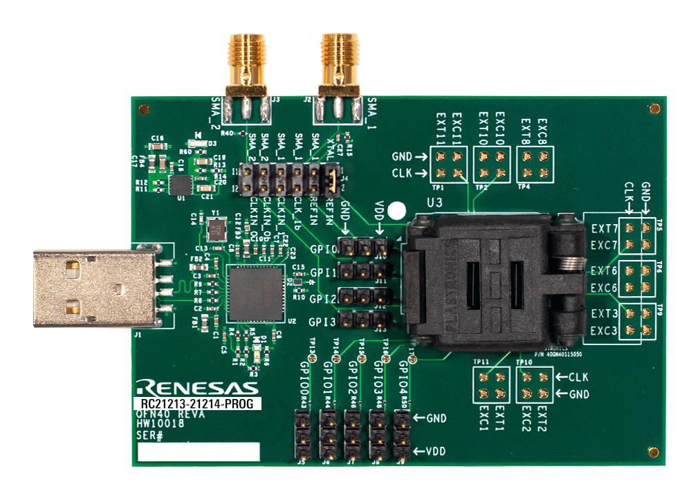 RC21213-21214-PROG is a 8-output AutoClock programming board. It eases the programming of the RC21213 and RC21214 programmable clock generator blank devices. With the on-board USB interface, the Renesas Integrated Circuit Toolbox (RICBox�) GUI software can be used to communicate with the blank device in the socket for configuration and programming. It is equipped with a single on-board LDO that takes voltage in from USB and supplies 3.3V to all device power domains. The board is designed to plug directly into any PC and be ready for use with the RICBox GUI and blank part. The RC21214/RC21213 programmer board is compatible with most 48-pin variants of the RC21214/RC21213.