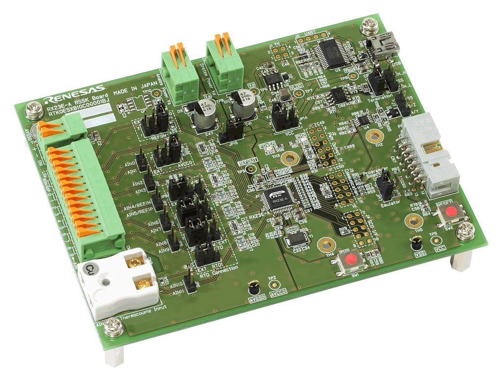 RX23E-A Renesas solution starter kit (RSSK) includes an RX23E-A mounted evaluation board with sensor measurement peripheral circuits. By using it with software downloadable from the website, users can start evaluating analogue features right after unboxing. The kit helps users shorten development period and improve time-to-market.