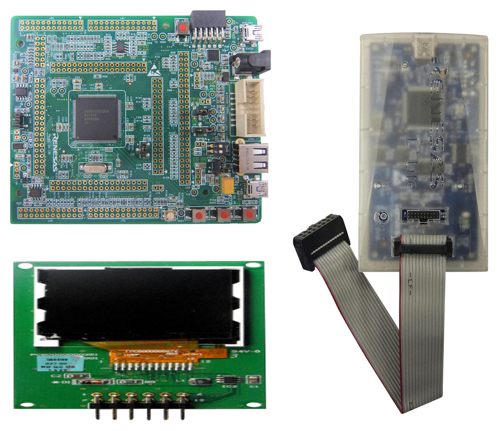 CPU board, Pmod compatible colour LCD board, E2 lite emulator.