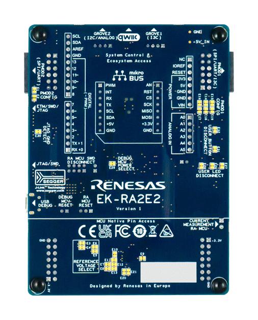 Evaluation kit for RA2E2 MCU group. The EK-RA2E2 evaluation kit enables users to effortlessly evaluate the features of the RA2E2 MCU group and develop embedded systems applications using Renesas' Flexible Software Package (FSP) and e2 studio IDE. Utilize rich on-board features along with users choice of popular ecosystem add-ons to bring big ideas to life. The EK-RA2E2 kit meets EMC/EMI standards and UL 94V-0 safety standards. Supports five most popular ecosystem expansions are MikroElektronika� mikroBUS connector, SparkFun® Qwiic® connector, two SeeedGrove® system (I2C and analogue) connectors, two Digilent Pmod� (SPI and UART) connectors and Arduino� (Uno R3) connector.