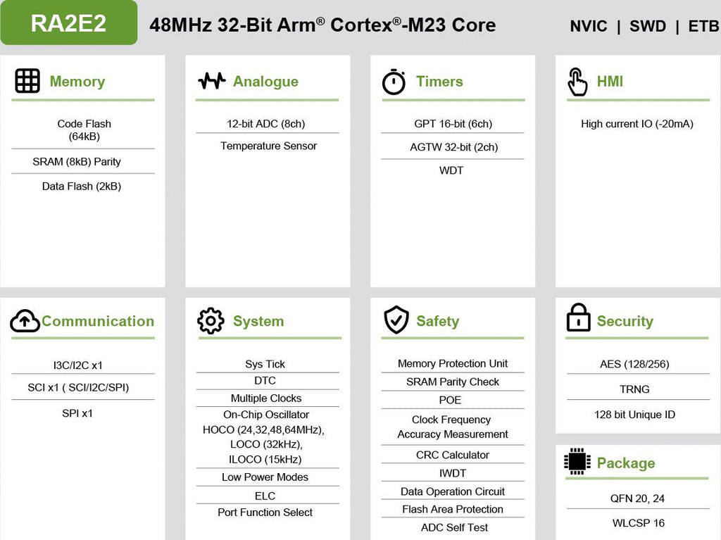 - R7FA2E2A72DNK MCU (referred to as RA MCU) with 48MHz, Arm® Cortex®-M23 core