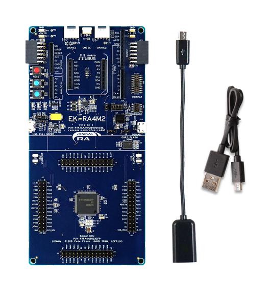 EK-RA4M2 v1 board, Micro USB device cable (type-A male to micro-B male), Micro USB host cable (type-A female to micro-B male).