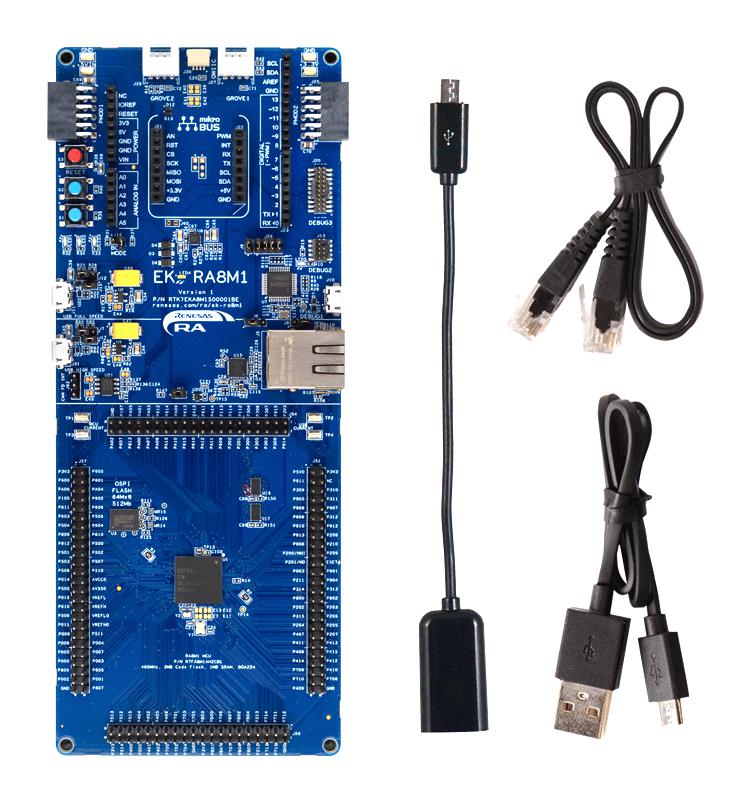 EK-RA8M1 board, Micro USB device cable (type-A male to micro-B male), Micro USB host cable (type-A male to micro-B male), Ethernet patch cable.