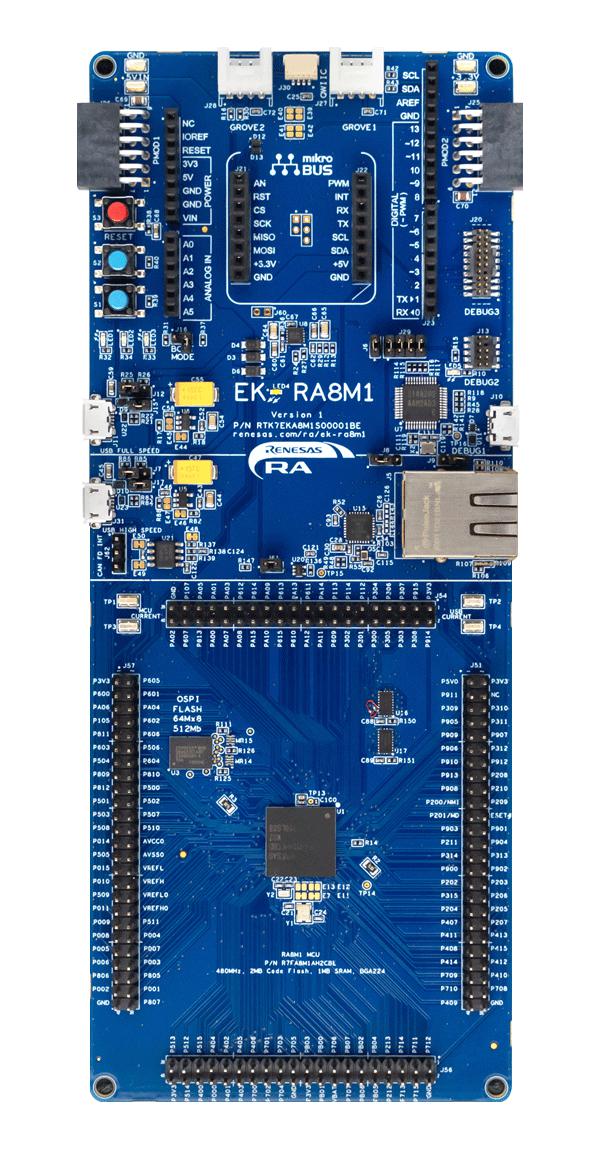 RTK7EKA8M1S00001BE is an EK-RA8M1 evaluation kit for the RA8M1 MCU group. The EK-RA8M1 evaluation kit enables users to effortlessly evaluate the features of the RA8M1 MCU group and develop embedded systems applications using Renesas' Flexible Software Package (FSP) and e2 Studio IDE. Utilize rich onboard features along with your choice of popular ecosystem add-ons to bring your big ideas to life.