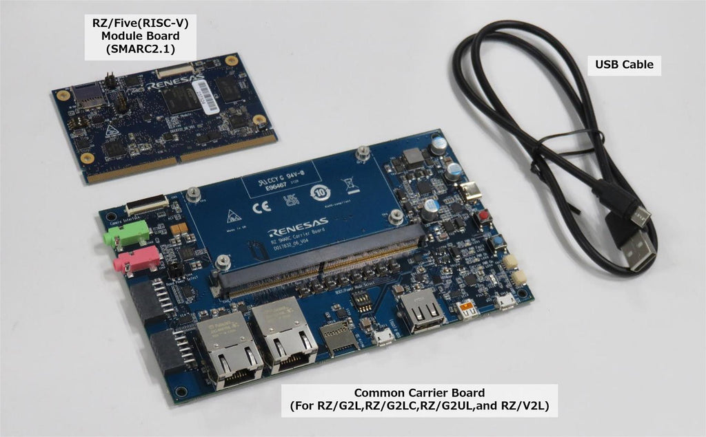RZ/Five EVK consists of a SMARC v2.1 module board and a carrier board. User can easily evaluate each device by replacing the SMARC v2.1 module board.