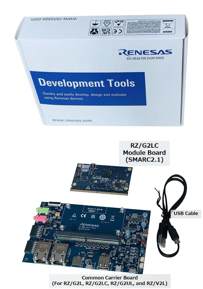 Evaluation board kit is ideal for evaluating RZ/G2LC. It consists of a module board (SOM) and a carrier board. The carrier board can be commonly used with RZ/G2L, RZ/G2UL and RZ/V2L modules (SOM) prepared according to the SMARC v2.1 standard. This allows to experience seamless and flexible evaluation between these devices.