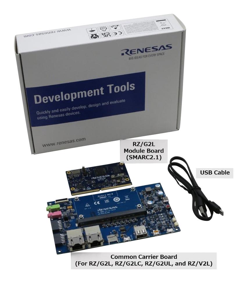 Evaluation board kit is ideal for evaluating RZ/G2L. It consists of a module board (SOM) and a carrier board. The carrier board can be commonly used with RZ/G2LC, RZ/G2UL and RZ/V2L modules (SOM) prepared according to the SMARC v2.1 standard. This allows to experience seamless and flexible evaluation between these devices.