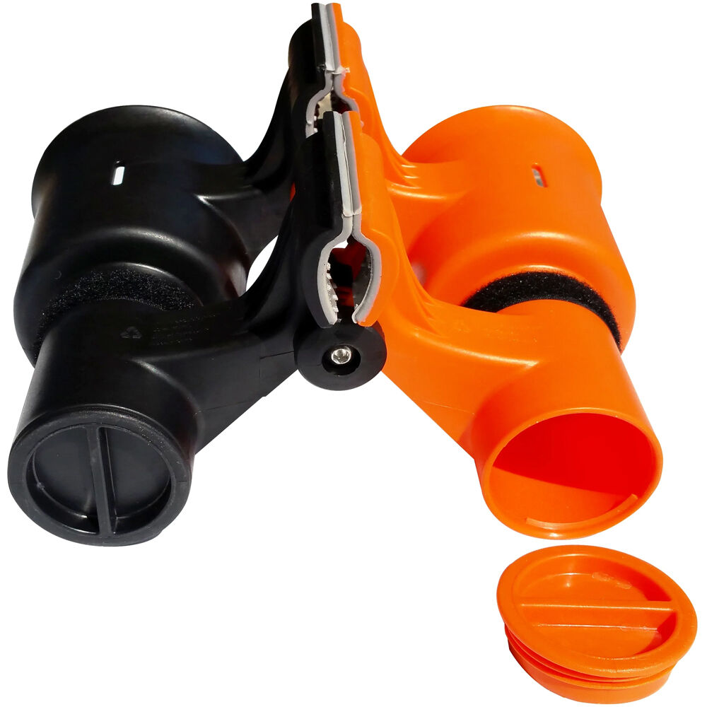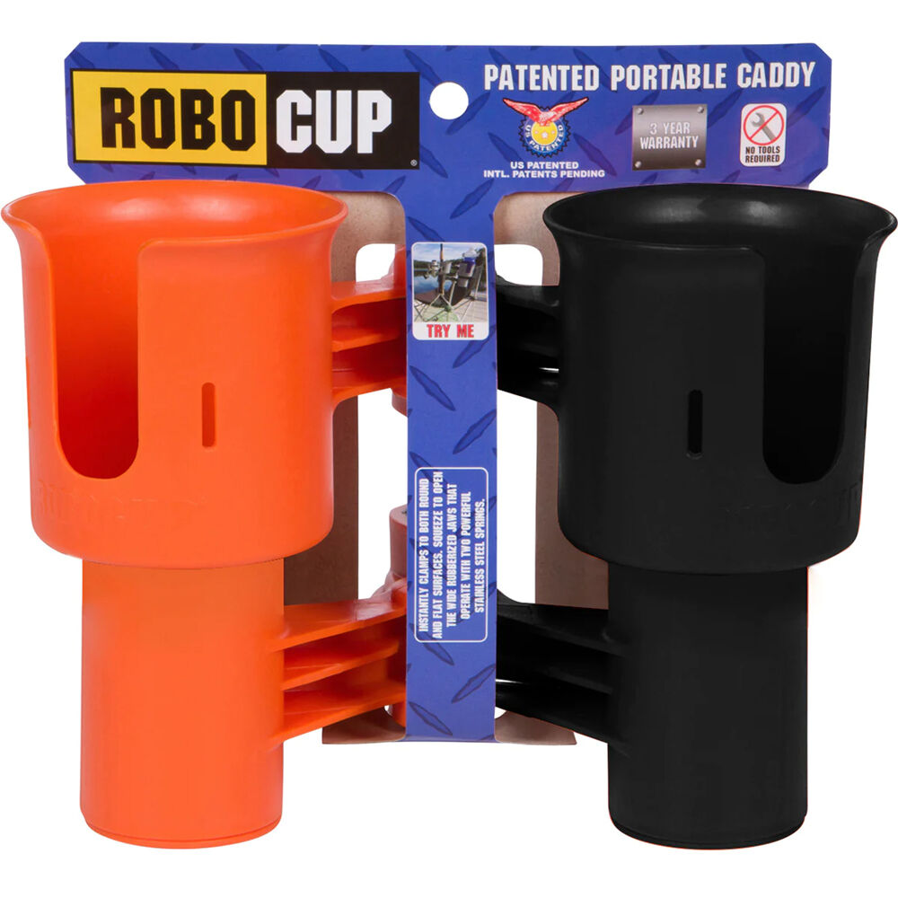 The orange & black RoboCup Clamp-On Dual-Cup & Drink Holder is a utility patented caddy that securely holds two drinks, tools, fishing poles, drumsticks, phone, keys, and much more by clamping instantly to both round and flat surfaces up to 2" in size.