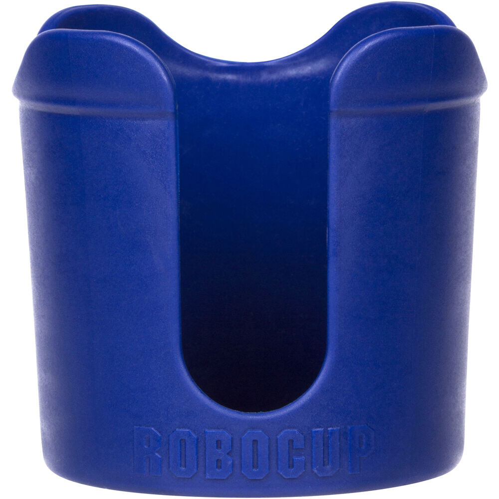 The navy RoboCup Plus is designed for large drinks up to a 3.75"/95mm in diameter including cups, mugs, glasses, koozies, tumblers and more. Perfect for Nalgene, Hydroflask, Yeti, RTIC, Contigo, Thermos and Camelbak. Attach using the provided two straps and tighten snugly to secure. Remove all existing straps from your RoboCup before attaching the Plus. For a more permanent attachment (not provided), use a stainless steel hose clamp for the top strap but be sure to not over-tighten and use a plastic cable-tie for the bottom strap.