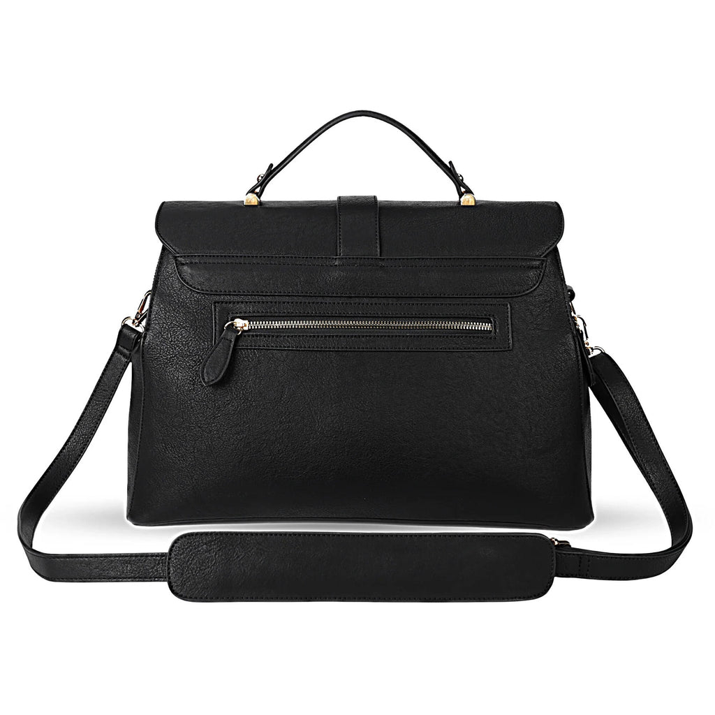 Use the black Dawn Laptop Handbag from Rofozzi to comfortably carry your daily essentials and a 13" MacBook Air. Combining style and utility, the Dawn has a water-resistant vegan leather exterior with a bright fabric interior and gold-toned fittings to present a sophisticated look. Unclasping the top flap reveals two zippered interior compartments on either side of the main section, one is padded to protect your 13" MacBook while the other stores folders, documents, or a book. The exterior rear pocket offers quick access to smaller items like your phone, cards, ID, or keys. The removable shoulder strap is adjustable and padded for enhanced comfort, and the top handle is useful for quick grab-and-go moments.