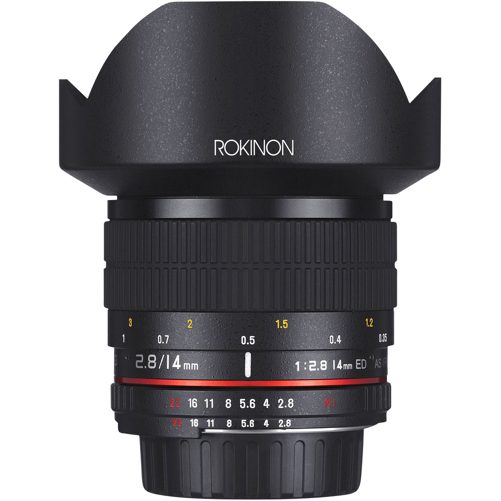 The 14mm f/2.8 IF ED UMC Lens for Canon EF with AE Chip from Rokinon gives you approximately a 115° view with dramatic results when used with a full frame digital camera or 35mm film camera. It includes a special chip that allows the lens to work with the camera's focus confirm, auto exposure, auto metering and auto white balance functions. With hybrid aspherical lenses, you will produce sharply defined images with a minimum of distortion and chromatic aberrations. This manual focus 14mm lens focuses as close as 0.9' (28cm) from the lens, and has a built-in petal-type lens hood. With some cameras, Shutter Lock must be disengaged on the camera's menu.
