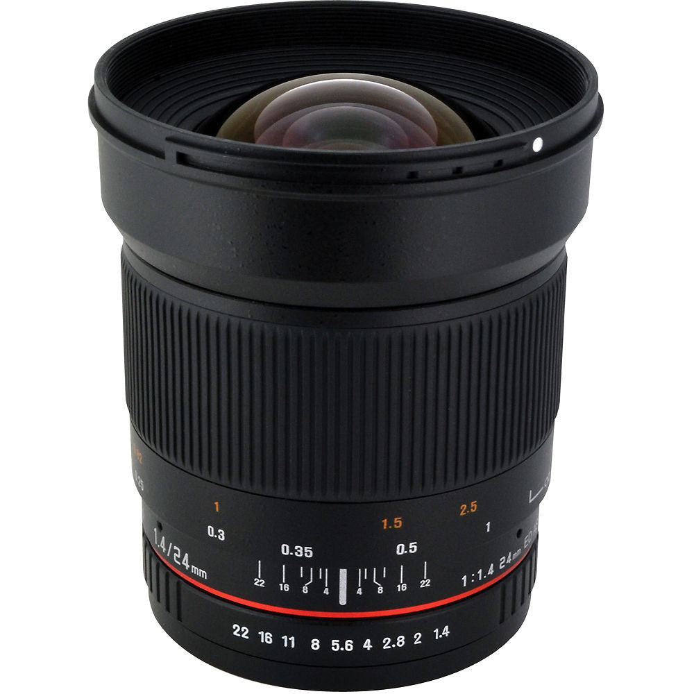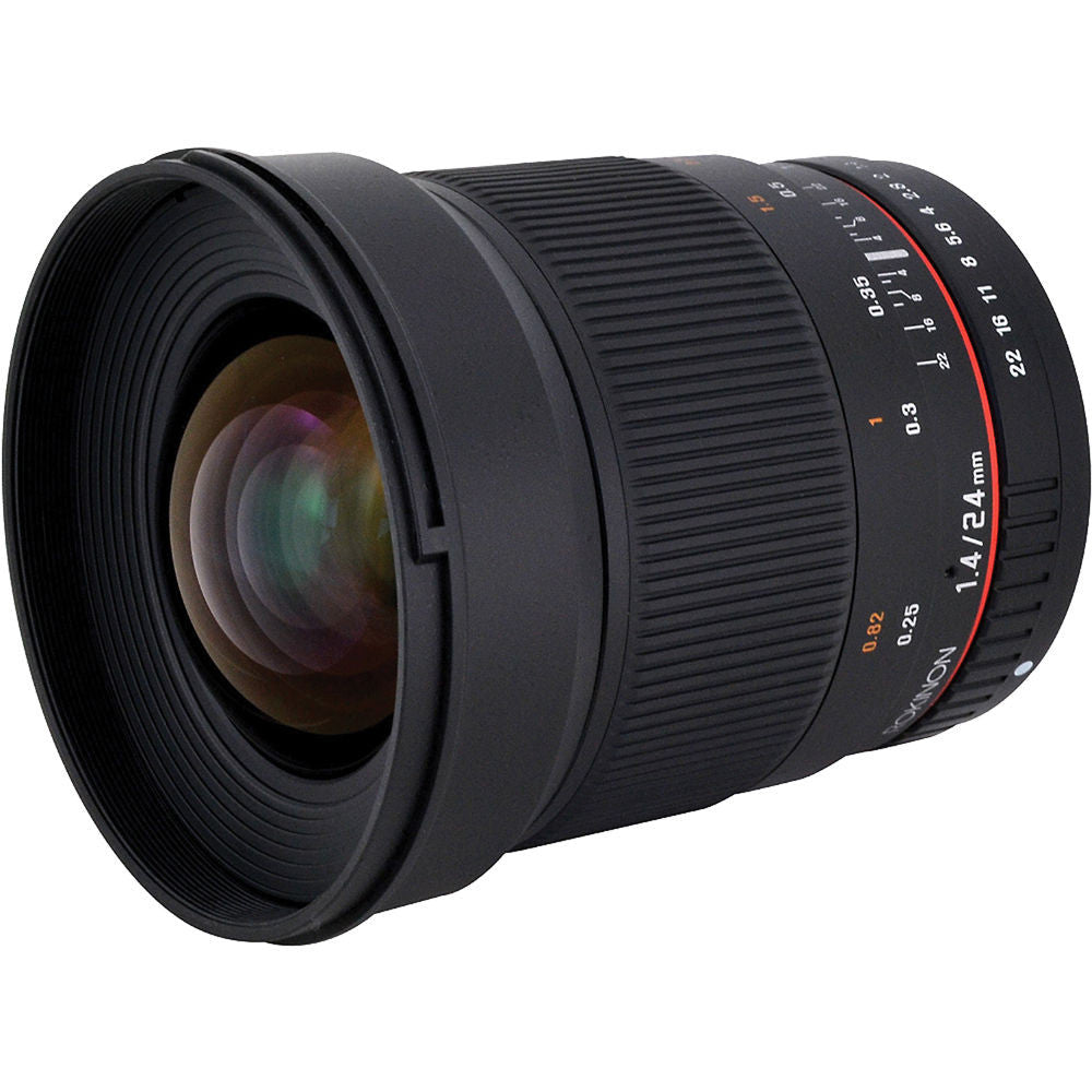 The Rokinon 24mm f/1.4 ED AS UMC Wide-Angle Lens for Canon gives you a wide 84° view when used with a full-frame 35mm camera, or 57.6° when used with an APS-C camera--excellent for landscapes, cramped interiors, street photography and general photography of all kinds. Four low-dispersion (ED) glass elements and two aspheric elements produce sharply defined images with a minimum of flare and ghosting. The lens focuses as close as 9.84" from the lens, giving you outstanding wide-angle close-up views. A multi-layered and anti-reflection UMC coating provides superb light transmission. All focus and exposure functions are manual--there is no autofocus or auto exposure.