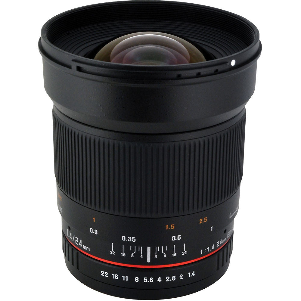 The Rokinon 24mm f/1.4 ED AS UMC Wide-Angle Lens for Nikon gives you a wide 84° view when used with a full-frame 35mm camera, or 57.6° when used with an APS-C camera--excellent for landscapes, cramped interiors, street photography and general photography of all kinds. Four low-dispersion (ED) glass elements and two aspheric elements produce sharply defined images with a minimum of flare and ghosting. The lens focuses as close as 9.84" from the lens, giving you outstanding wide-angle close-up views. A multi-layered and anti-reflection UMC coating provides superb light transmission. This lens will operate in Aperture Priority, Shutter Priority, Program, and Manual exposure modes. It features an Automatic Chip for focus confirmation and aperture and other setting adjustments directly from camera's interface.