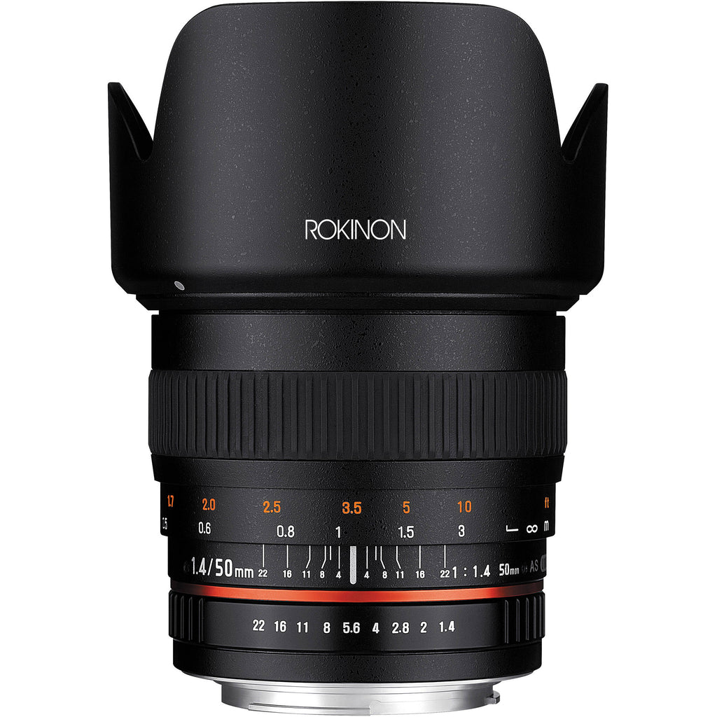 The 50mm f/1.4 AS IF UMC Lens for Canon EF Mount from Rokinon offers a standard 50mm focal length in the full frame format and a very fast f/1.4 maximum aperture for effective low light shooting, fast shutter speed capture, and shallow depth of field control. When used on cameras with an APS-C format sensor its 35mm focal length equivalence is 80mm.