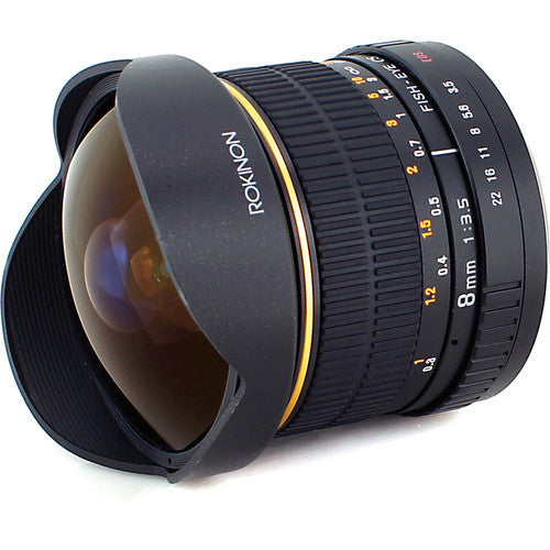 The 8mm Ultra Wide Angle f/3.5 Fisheye Lens for Nikon F from Rokinon gives you a 180° view with dramatic, exaggerated perspective when used with an APS-C camera, or a circular image floating in the frame when used with a full frame digital camera or 35mm film camera. With hybrid aspherical lenses and multi-layer coating, you will produce sharply defined images with a minimum of flare and ghosting. The 8mm manual focus lens focuses as close as 1' (30.48 cm) from the lens, and has a built-in petal lens hood.