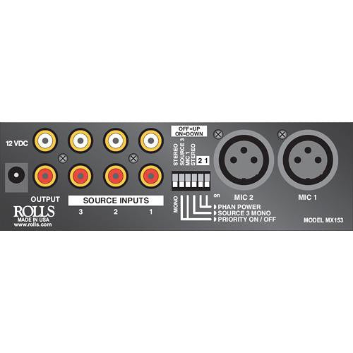 The Rolls MX153 MixMate is a compact two microphone and three stereo source mixer designed mainly for installation purposes. It's ideal for small restaurants, clubs, churches, schools, or any application where two paging or announcing microphones need to be mixed with stereo sources such as AM/FM tuners, CD players, jukeboxes, and video players. Priority talk over is provided on Mic Channel 1 for paging, and on Source Channel 3 for a jukebox, telephone, etc.