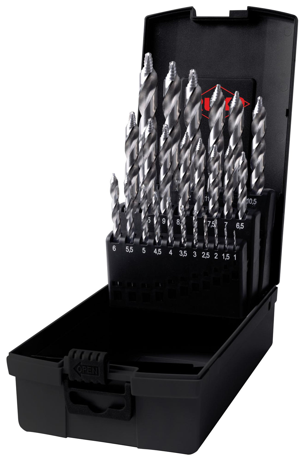 259215RO is a 25-piece set of DIN 338 type FLOWSTEP® twist drills with Ø 1mm up to 13mm in increments of 0.5mm in plastic case.