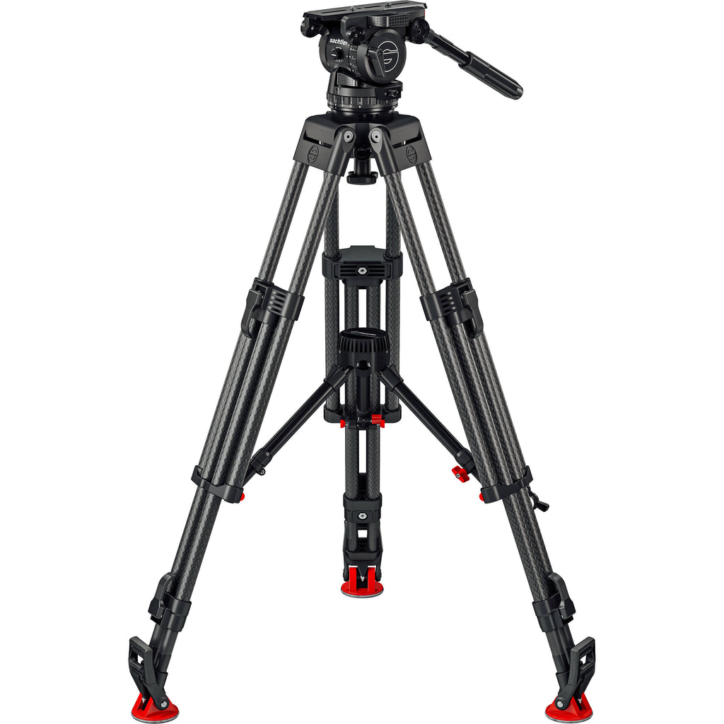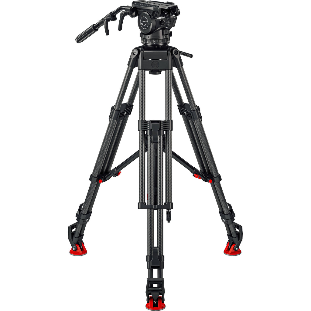 The CF 100 ENG HD 2CF Mid-Level Tripod System with Cine 20 Fluid Head from Sachtler pairs the Cine 20 fluid head and the carbon fiber CF 100 ENG HD 2CF tripod legs with a mid-level spreader. This kit offers a fluid head 48 lb payload for midsized camera rigs, as well as a sideload camera plate, 16 steps of counterbalance, and seven steps of pan/tilt drag. Carry the system with the included handle and bag for easy transport to the set.
